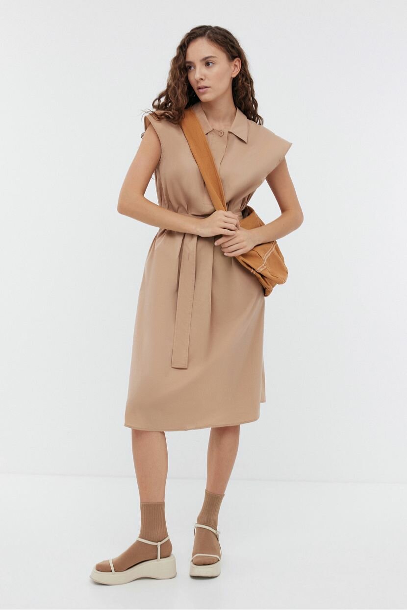 Однотонное платье понравится ценительницам минимализма и тотал лука. Оно отлично подойдет для делового стиля и украсит аутфиты в офис. Уместно для прогулок и повседневных задач. Прямой силуэт эффектно смотрится и подчеркивает контуры. Удобная посадка дарит ощущение раскованности. Лаконичный дизайн делает его образцом элегантности в гардеробе на каждый день. Планка скрывает застежку на пуговицы. Отложной воротник напоминает классический рубашечный крой. Пояс из основной ткани ставит акцент на линии талии. Модель миди с коротким рукавом выполнена из хлопкового поплина с гладкой приятной к телу фактурой. Дышащие свойства материала обеспечивают оптимальную терморегуляцию. Добавление эластана повышает растяжимость и износостойкость полотна. Полиамид препятствует пилингу и помогает сохранить безупречный внешний вид надолго.