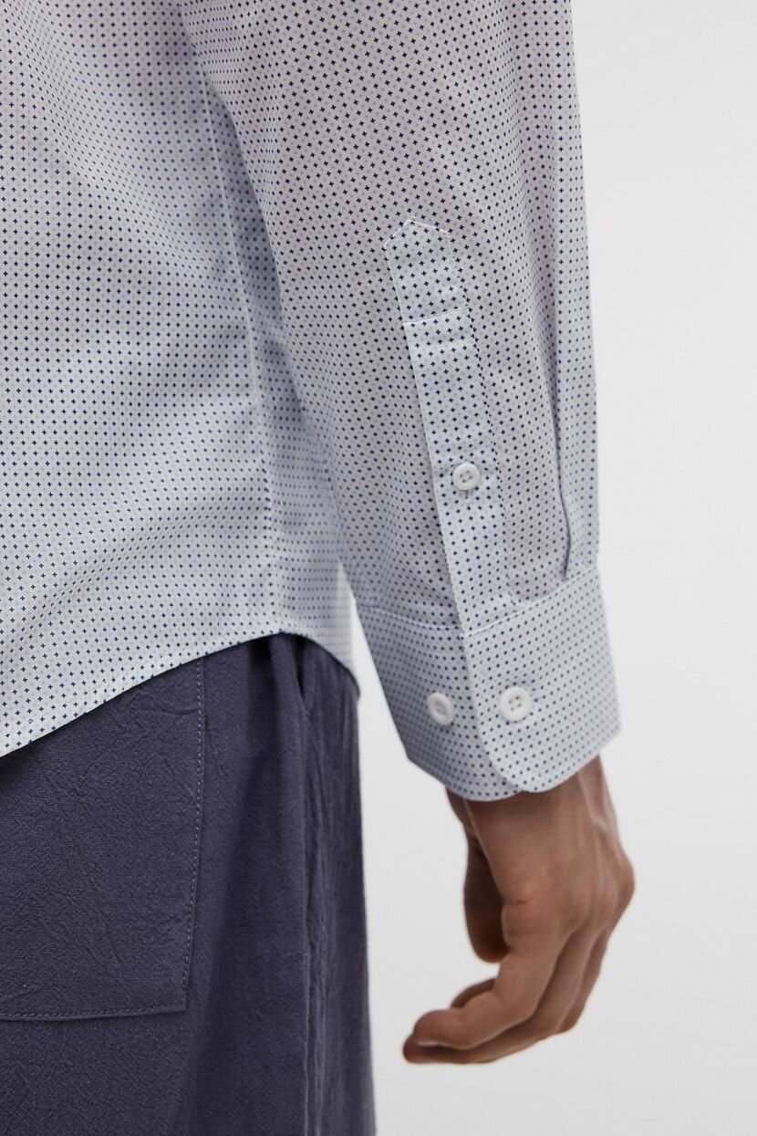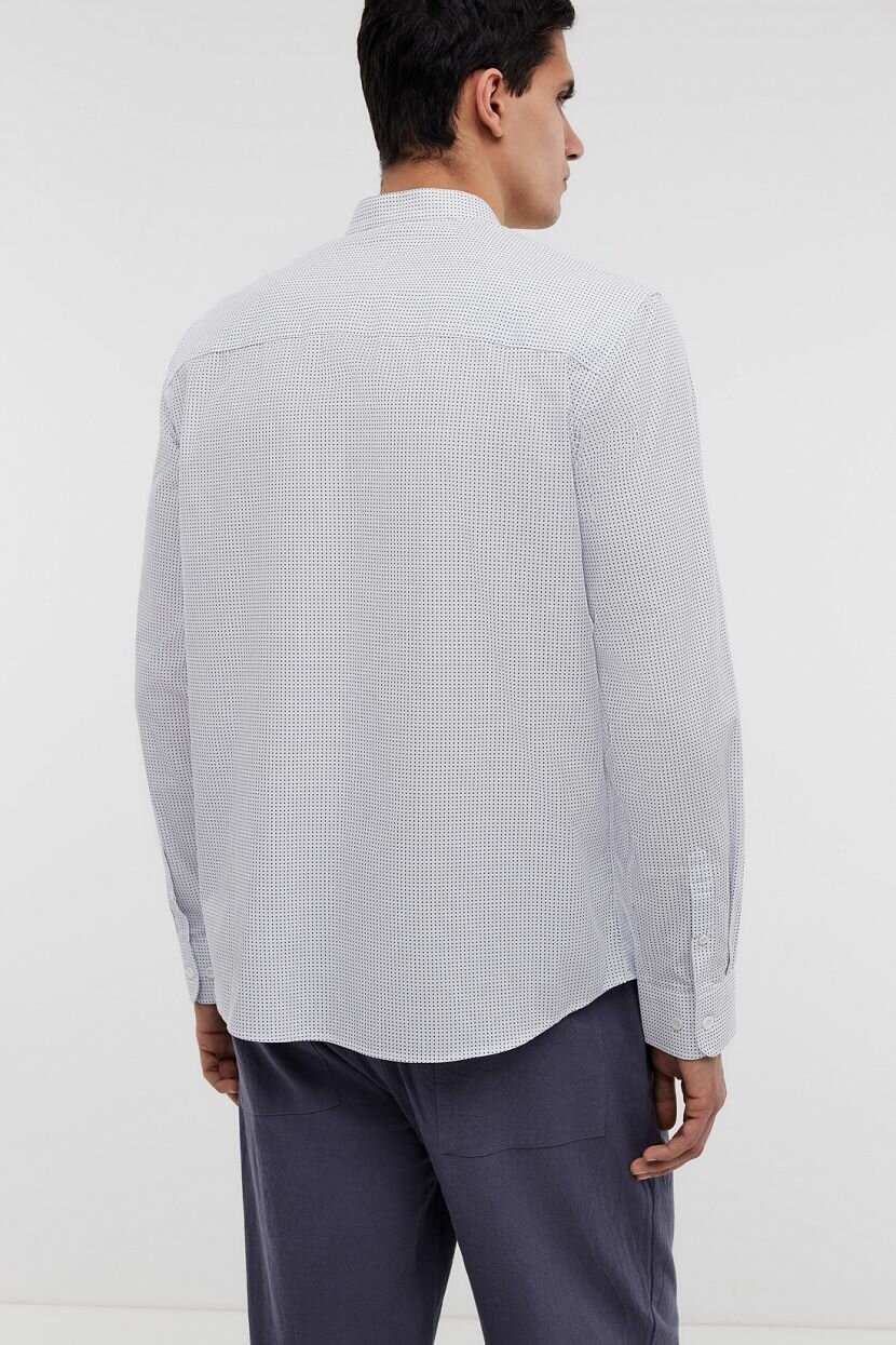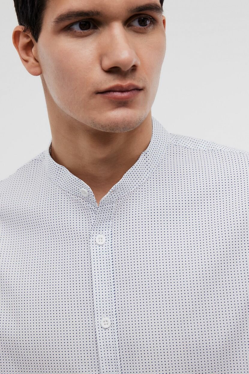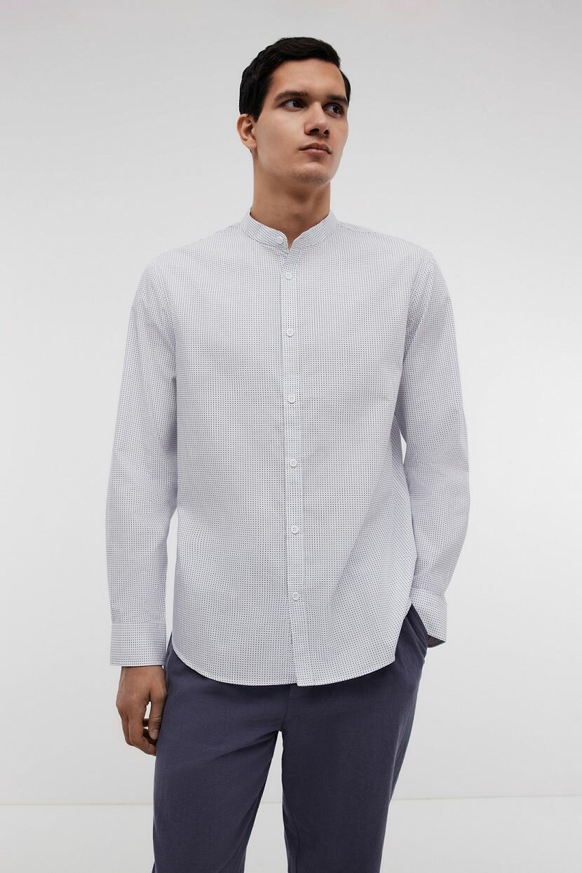 Мужская рубашка выполнена в универсальном прямом силуэте. Классический крой оптимально подходит мужчинам любой комплекции и дарит свободу движений в течение дня. Она создана для неформальных встреч. Может стать элегантной базой деловых образов при наличии строгого офисного дресс-кода. Повседневные аутфиты обретут стильный акцент. Фигурная линия низа позволяет носить навыпуск или заправлять, открывая возможности для стилизации. Длинные рукава завершаются манжетами на пуговицах, которые регулируют прилегание. Воротник-стойка самодостаточна и гармонично дополняет изделие. Модель из хлопка с принтом сшита из мягкого легкого полотна. Натуральный хлопковый материал приятен на ощупь и отличается прочностью. Он прост в уходе и обладает дышащими свойствами.