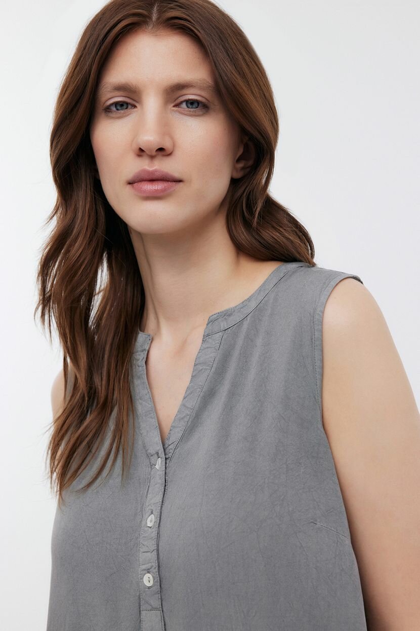 Блузка женская без рукавов уместна в повседневном гардеробе на каждый день. Элегантная минималистичная модель отлично подходит для деловых аутфитов и неформальных встреч. Ее можно носить самостоятельно или интегрировать в многослойные комплекты. Прямой крой красиво садится по фигуре вне зависимости от комплекции. В меру свободный силуэт дарит ощущение легкости движений. Воротник-стойка и укороченная планка на пуговицах в тон дополняют изделие. Garment dyed - эффектная технология окрашивания материала, которая была применена для создания уникального оттенка и перелива цветов на ткани. Блуза выполнена из невесомой мягкой вискозы с бархатистой фактуры. Вискозное полотно эластично и устойчиво к деформации. Оно практически не мнется и сохраняет безупречный внешний вид.