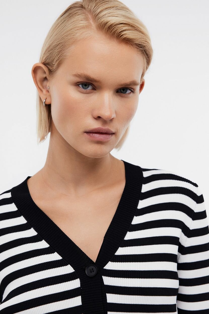 Женский кардиган - удобная и модная база гардероба. Она актуальна и сохраняет трендовые позиции. Универсальную вещь легко стилизовать и наслаждаться ношением несколько сезонов. Ее можно органично интегрировать в деловые и повседневные образы. Уместно надеть в офис или составить романтичный аутфит для прогулки. Облегающий силуэт красиво садится по фигуре, подчеркивая достоинства. Укороченная модель с V-образным вырезом имеет стильный минималистичный дизайн. Комбинированная полоска смотрится элегантно и лаконично. Застегивается на пуговицы в тон планке. Рибовое переплетение создает плотную устойчивую фактуру материала, которая отлично держит форму. Выполнен из мягкой вискозной пряжи. Добавление полиамида увеличивает эластичность и дает возможность сохранить привлекательный внешний вид изделия как можно дольше.