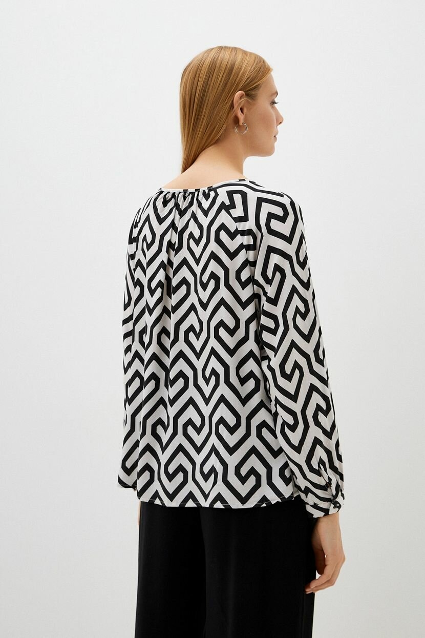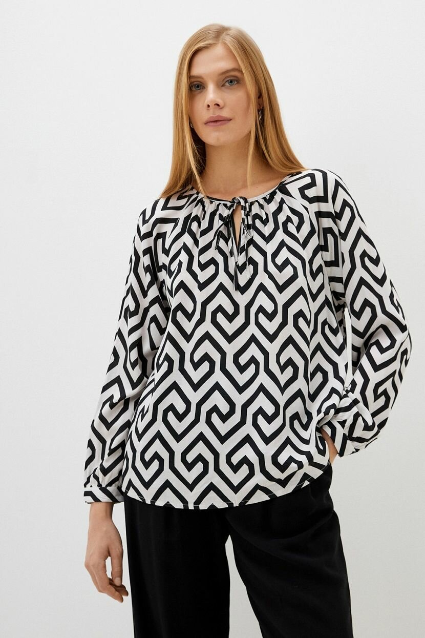 Блузка женская станет стильной составляющей образа. Она гармонично сочетается с другими предметами базового гардероба. Блуза со сборкой по круглой горловине на завязках подходит для деловых и повседневных луков. Геометричный принт лаконичный и универсальный. Он олицетворяет сдержанную роскошь и органично смотрится в аутфитах на каждый день. Контрастное цветовое решение выглядит утонченно. Кофта невероятно комфортная и удобная в носке благодаря свободному силуэту. Длинные рукава завершаются манжетами на пуговицах. Модель сшита из легкого и воздушного вискозного полотна. Его дышащие свойства обеспечивают оптимальную терморегуляцию. Материал приятно охлаждает кожу и сохраняет привлекательный внешний вид.