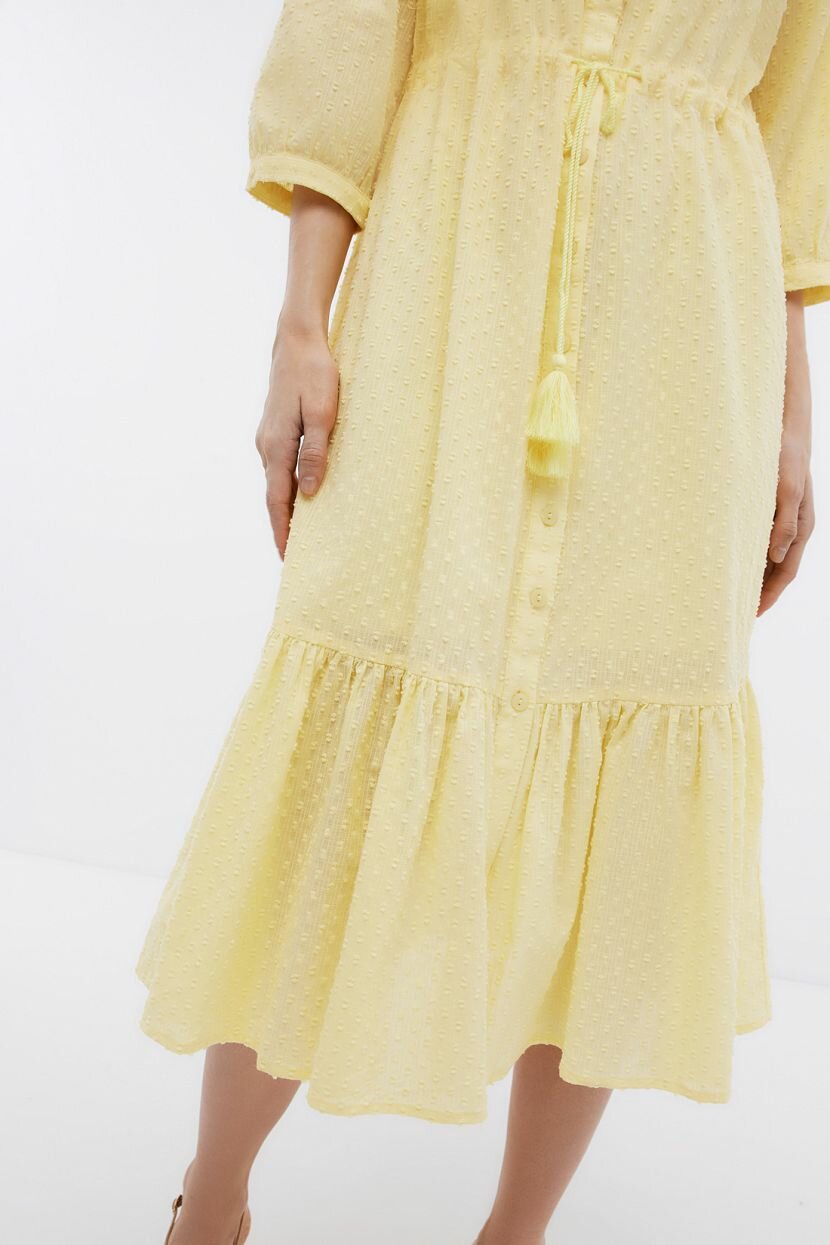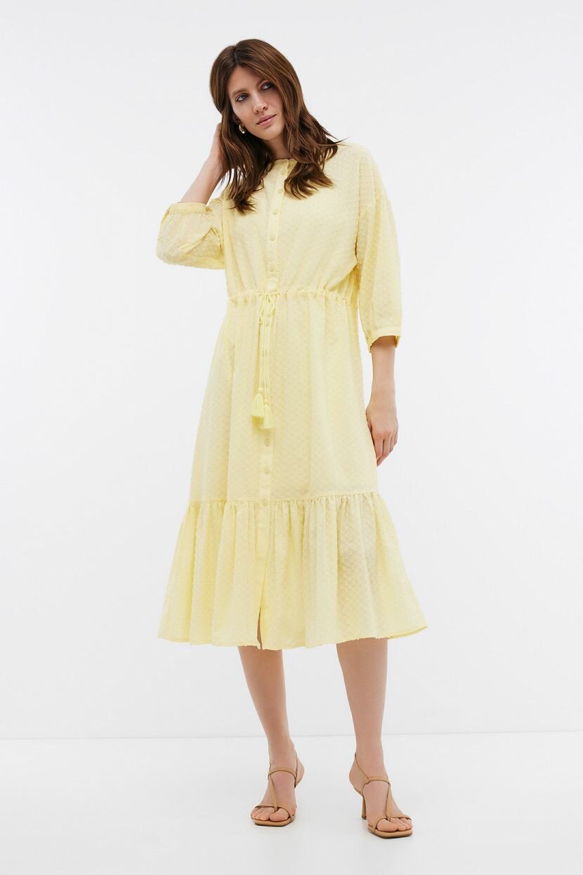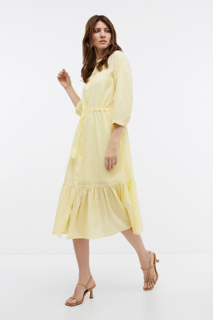 Модный тренд на воздушность и легкость силуэта в полной мере проявились в данной модели длины миди. Платье рубашка в актуальном оттенке станет стильным решением для повседневного образа. Оно будет органично смотреться в аутфите для романтических свиданий и торжественных мероприятий. Кулиска по линии талии подчеркивает гармонию и женственность пропорций. Шнурок с кисточкой для утяжки служит лаконичным украшением. Небольшой воротник-стойка плавно переходит в планку на пуговицах. Функциональные карманы в боковых швах позволяют иметь нужные мелочи под рукой. Оборка на подоле дополняет крой и его ярусным. Изделие сшито из невесомого полупрозрачного хлопка с добби-эффектом. Ткань обладает интересным переплетением нитей, напоминающих вышивку. Она воздухопроницаем и не мнется. Предусмотрена подкладка в виде нижнего сарафана на тонких бретелях для комфортной посадки, который выполнен из мягкого вискозного трикотажа джерси с добавлением эластана.
