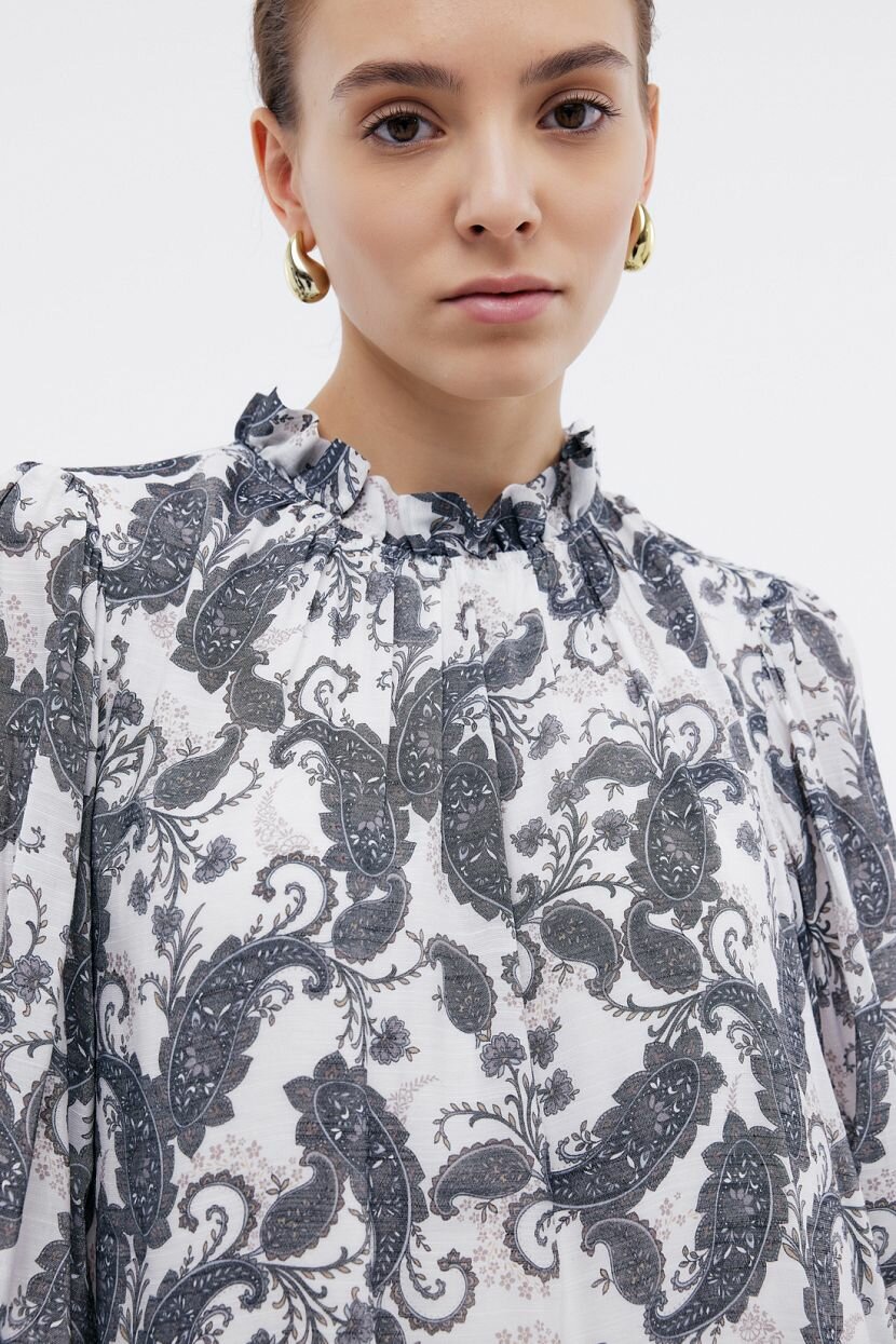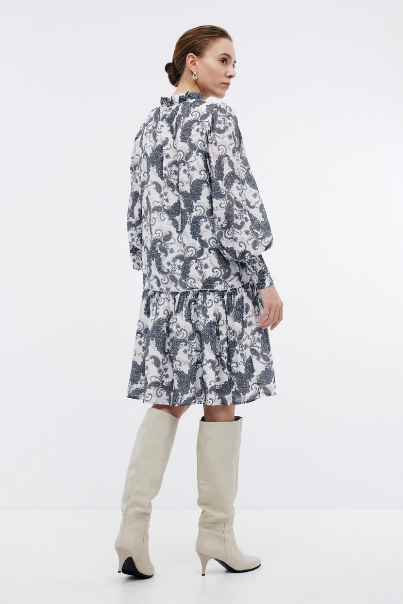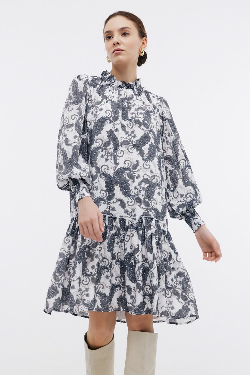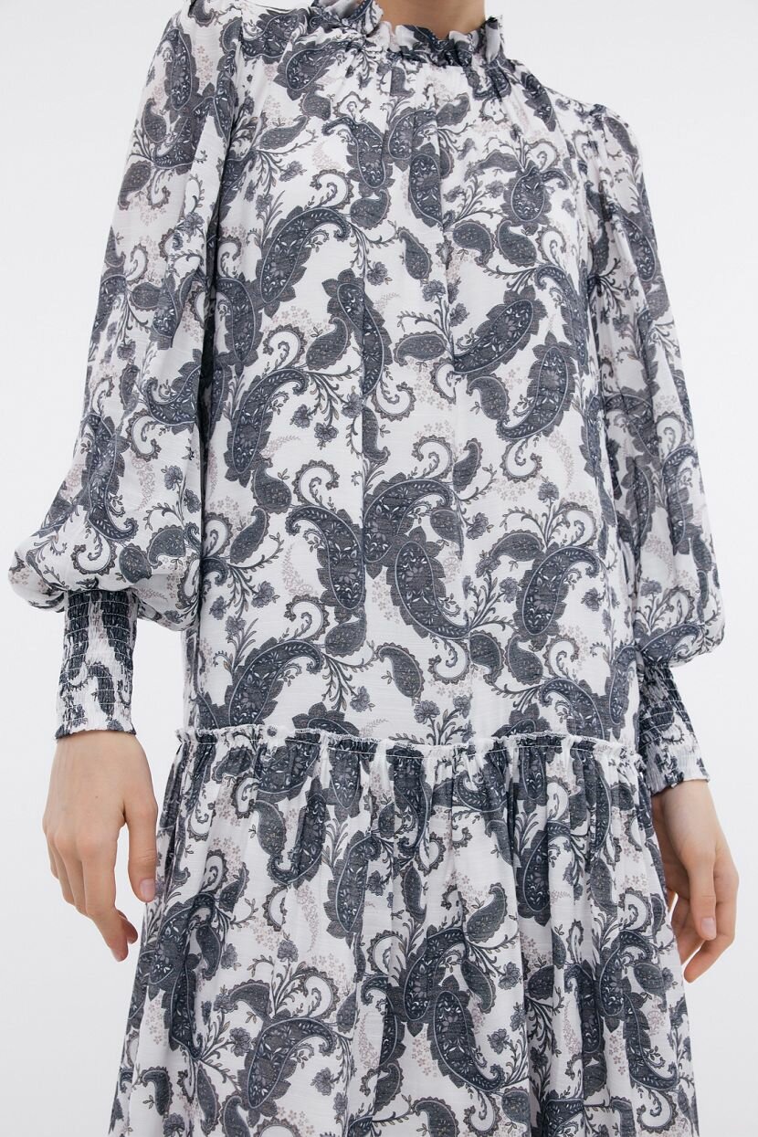 Эффектное платье выполнено из лёгкой полупрозрачной ткани и дополнено плотной подкладкой. Материал драпируется мягкими складками вдоль высокого воротника с застёжкой-пуговицей, заниженной линии талии и эластичных манжет. Рюши и складки подчеркнут женственность и романтичность вашего образа. Классический узор пейсли с ориентальным колоритом выступает главным акцентом данного изделия, поэтому рекомендуем сочетать платье с однотонными аксессуарами и обувью.Платье выполнено из дышащей струящейся ткани. Вискоза комфортна в любую погоду: в одежде из такого материала не бывает жарко или холодно. Добавление полиэстера делает материал более прочным и несминаемым. Обратите внимание: натуральные волокна могут дать усадку при стирке, поэтому стирайте платье в прохладной воде и обязательно отутюжьте, пока ткань остаётся влажной.