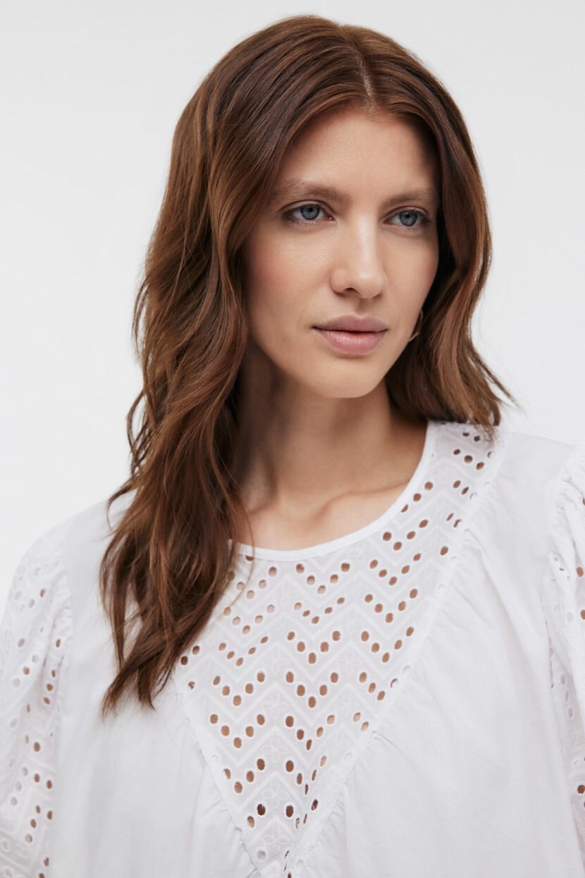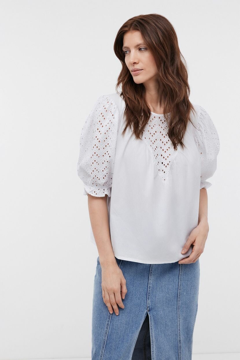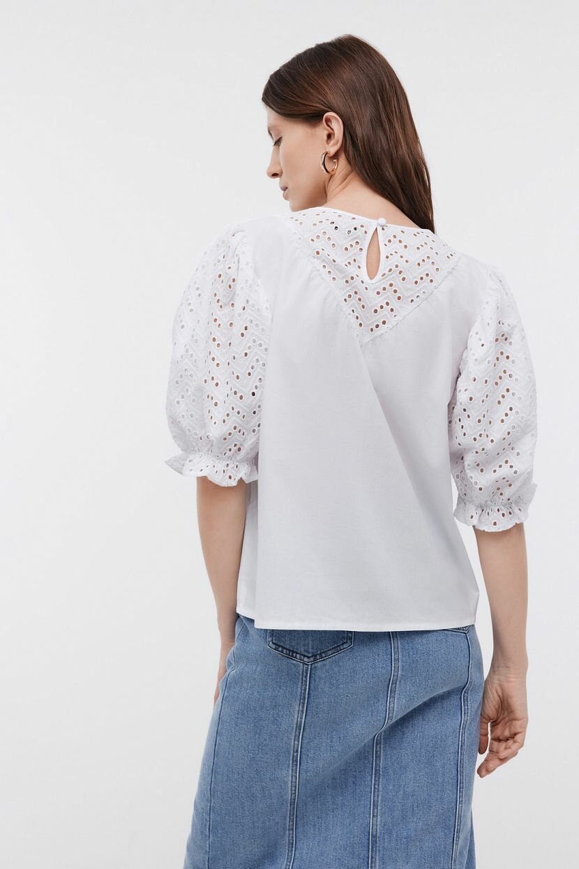 Блузка женская сочетает легкий гладкий поплин и изящную отделку из хлопкового шитья. Такая комбинация делает повседневный образ более эффектным и стильным. Блуза уместна в строгих деловых комплектах и практичных кэжуал аутфитах. Ее легко стилизовать и интегрировать в наряды для любого случая жизни. Пышные объемные рукава - модный акцент, который идеально вписывается в общую романтическую концепцию. Застежка расположена на горловине со стороны спинки. Хлопок является удачным вариантом для луков на каждый день. Его использование для пошива модели продиктовано практичностью и безграничным удобством. Он мягкий и дышащий. Благодаря гигроскопичности и способности обеспечить комфортную терморегуляцию, материал оптимален для ношения в любое время года.