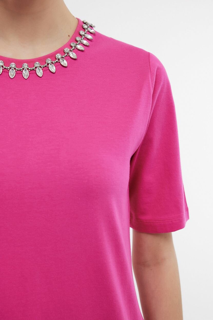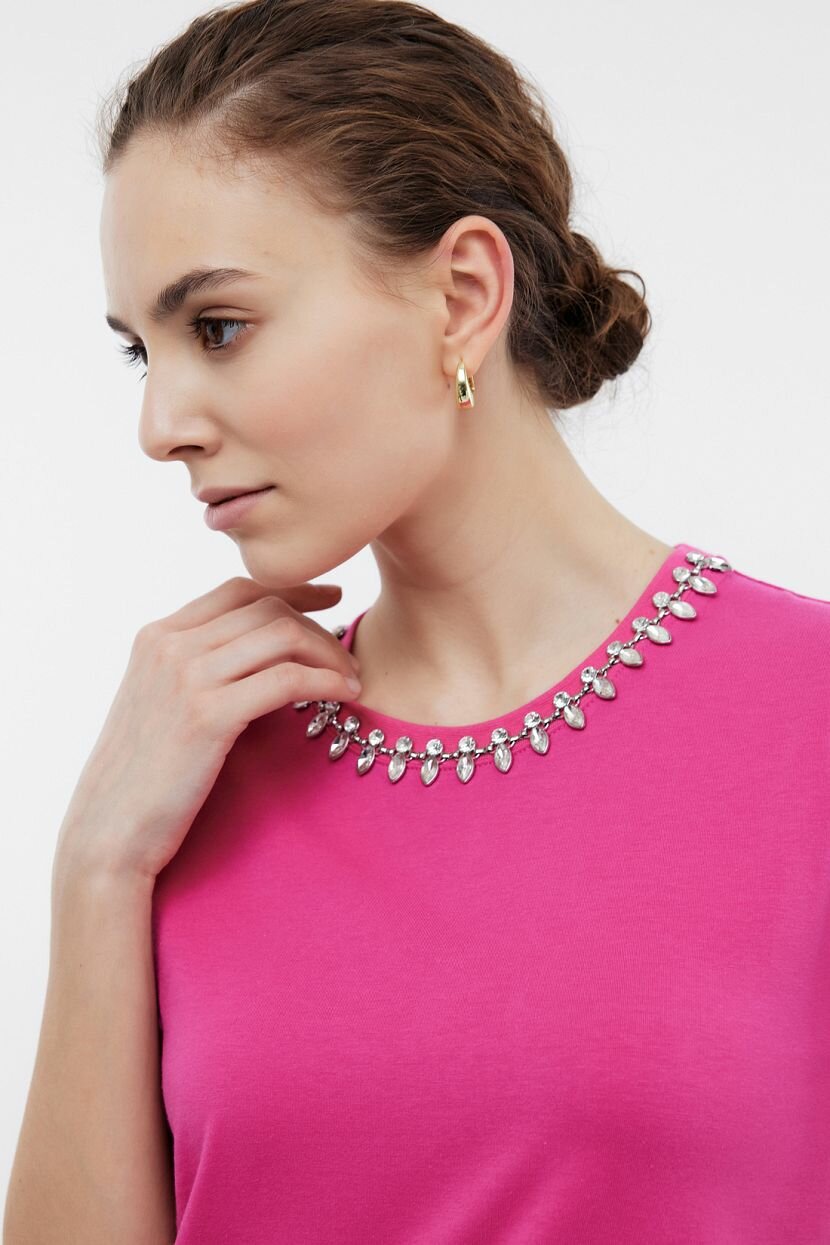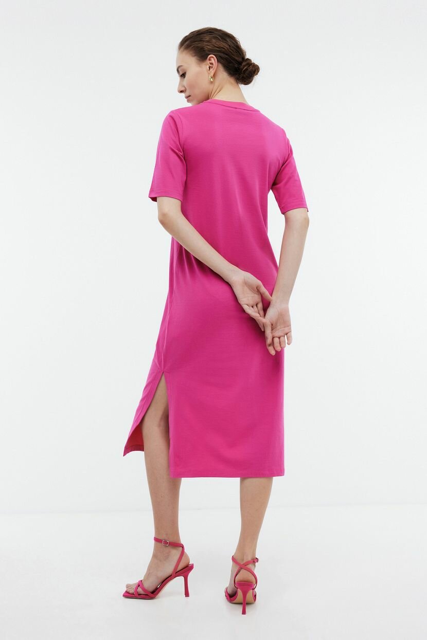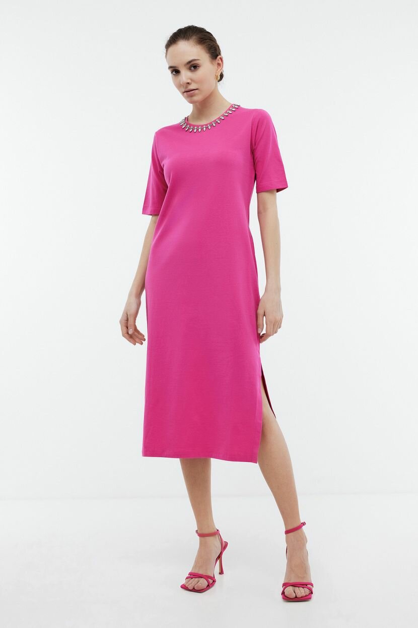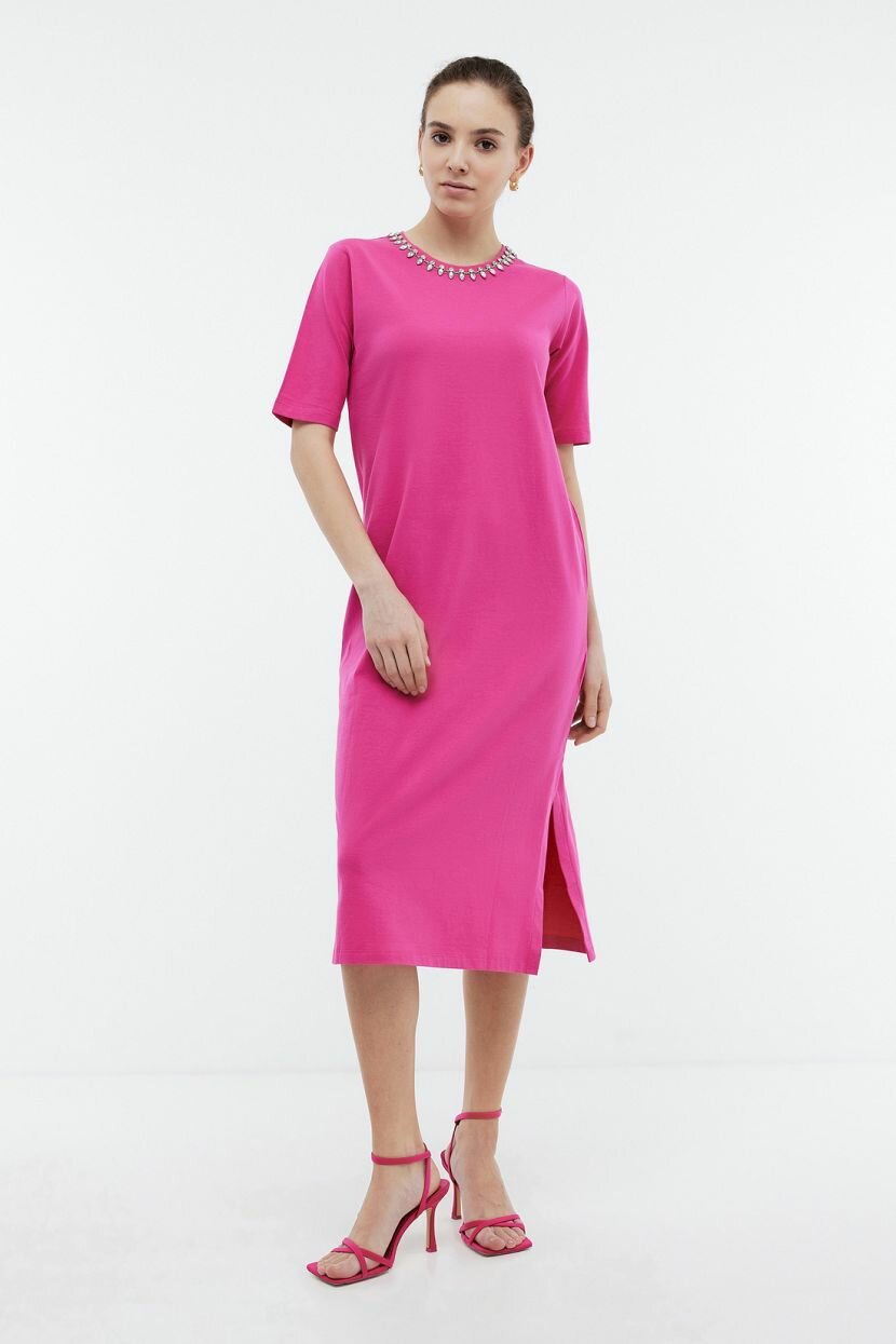 Трикотажное платье длины миди отличается простыми линиями и лаконичным кроем, которые уместны в деловом и повседневном образе. Прямой силуэт придает сдержанность и красиво смотрится вне зависимости от комплекции. Однотонная модель, напоминающая футболку, украшена пришивными сияющими стразами. Они окаймляют круглый вырез и напоминают ожерелье. Планка горловины отделена фактурным трикотажем в рубчик. Это препятствует растяжению ворота при активной носке. Боковые разрезы эффектно выглядят и обеспечивают удобство движений. Изделие с коротким рукавом выполнено из хлопкового трикотажа. Натуральный хлопок мягкий и плотный. Вязка джерси увеличивает эластичность и прочность полотна. Благодаря добавлению эластана, материал прекрасно держит форму и сохраняет насыщенный цвет.