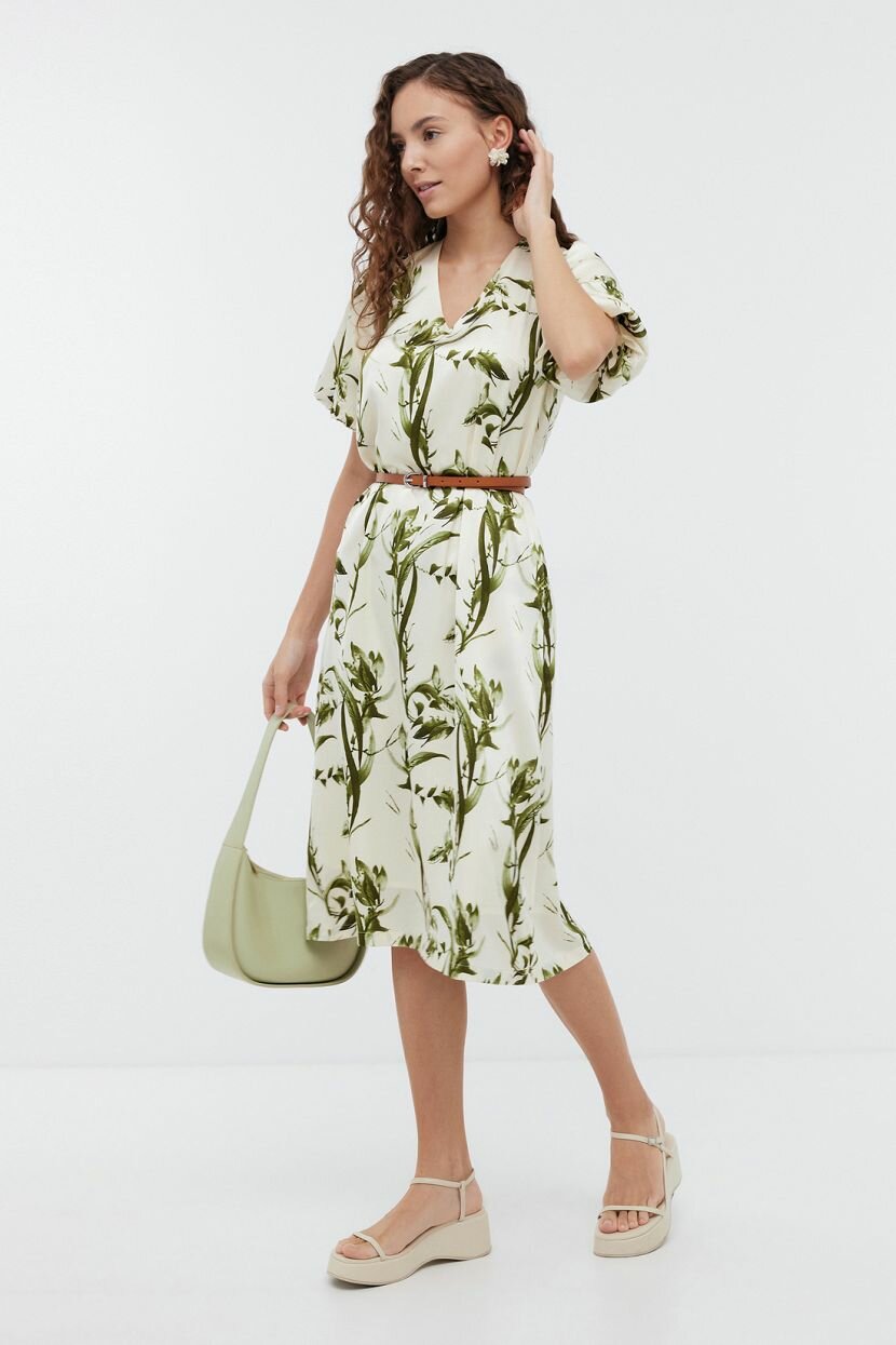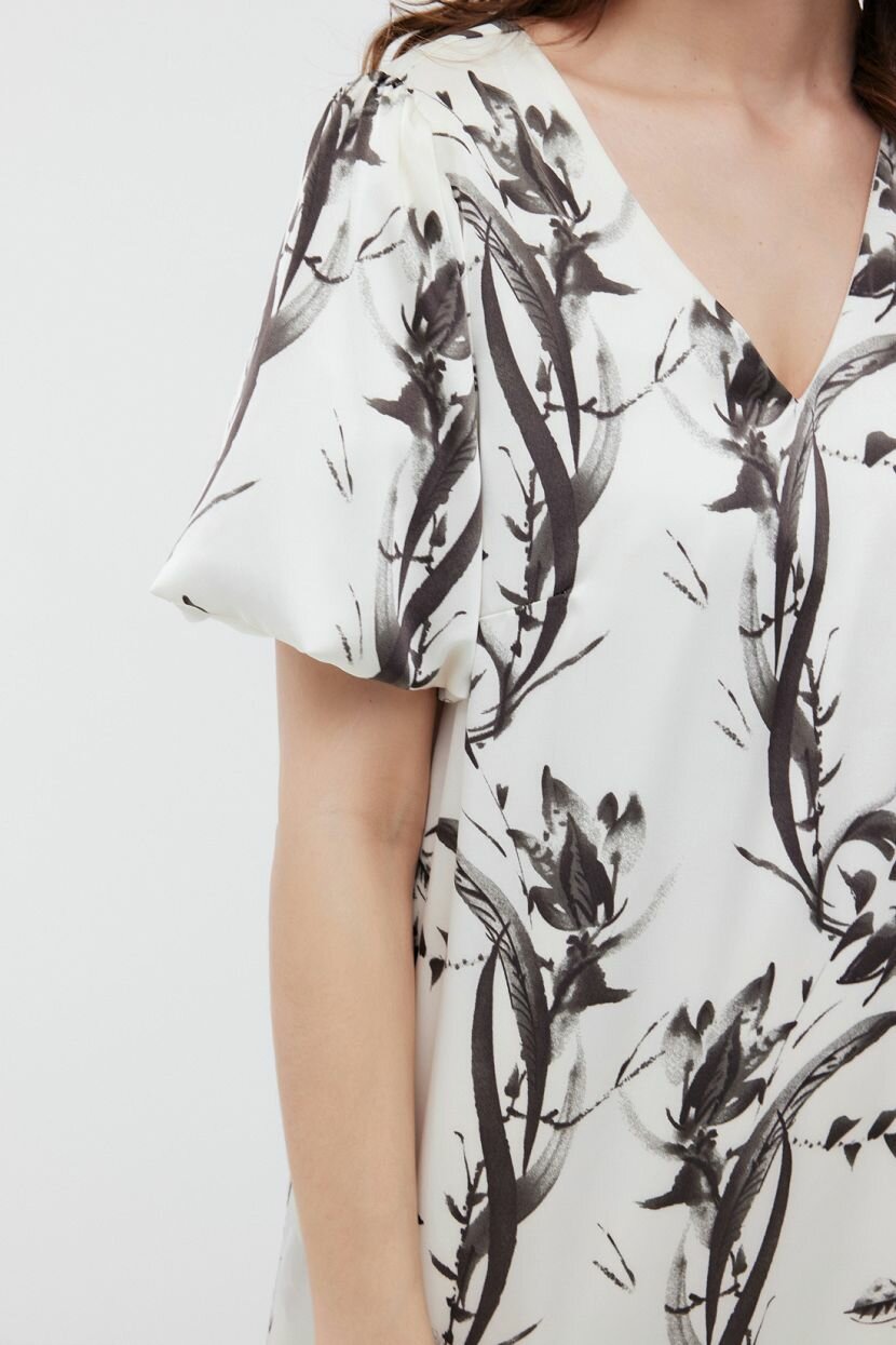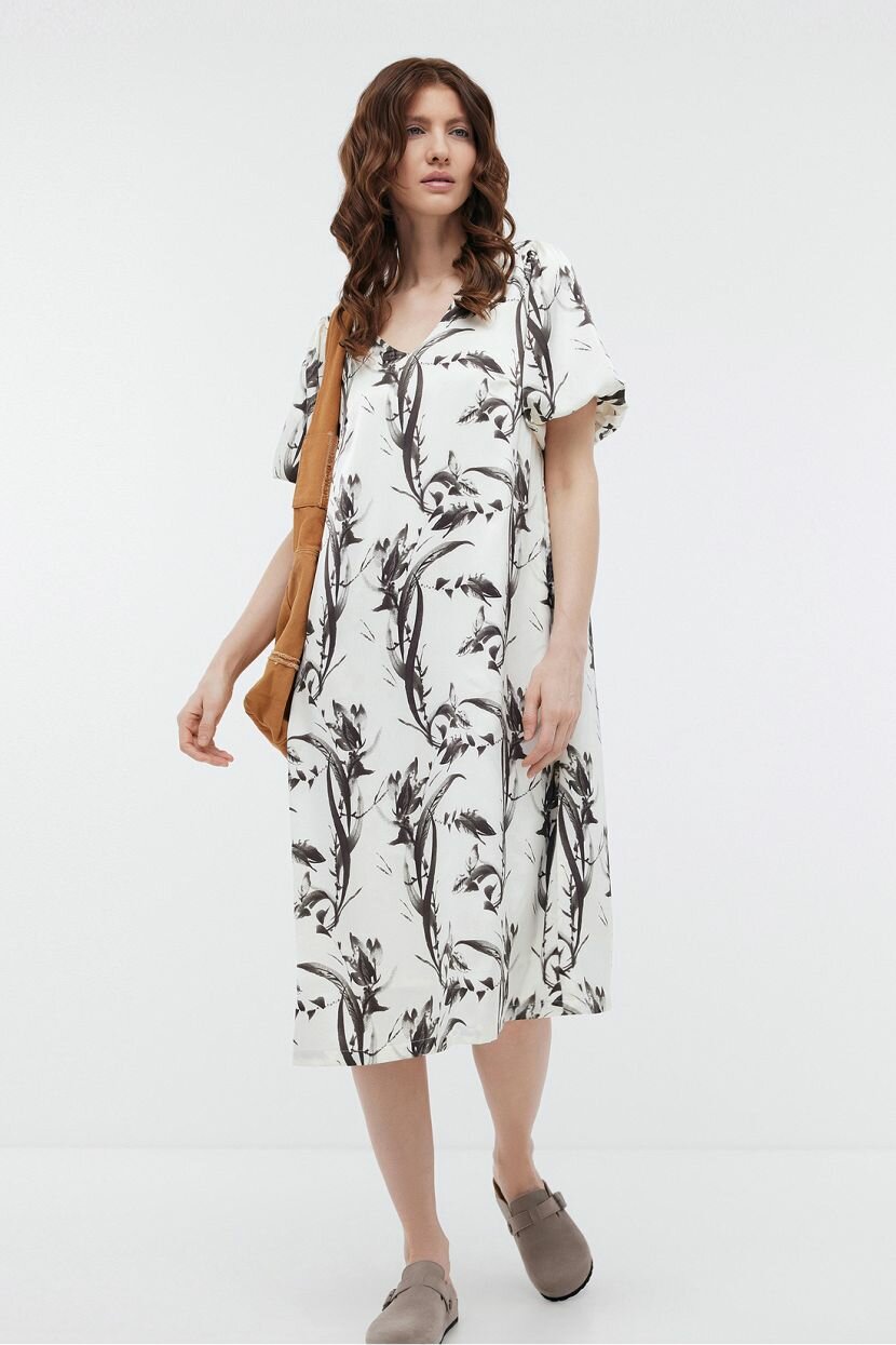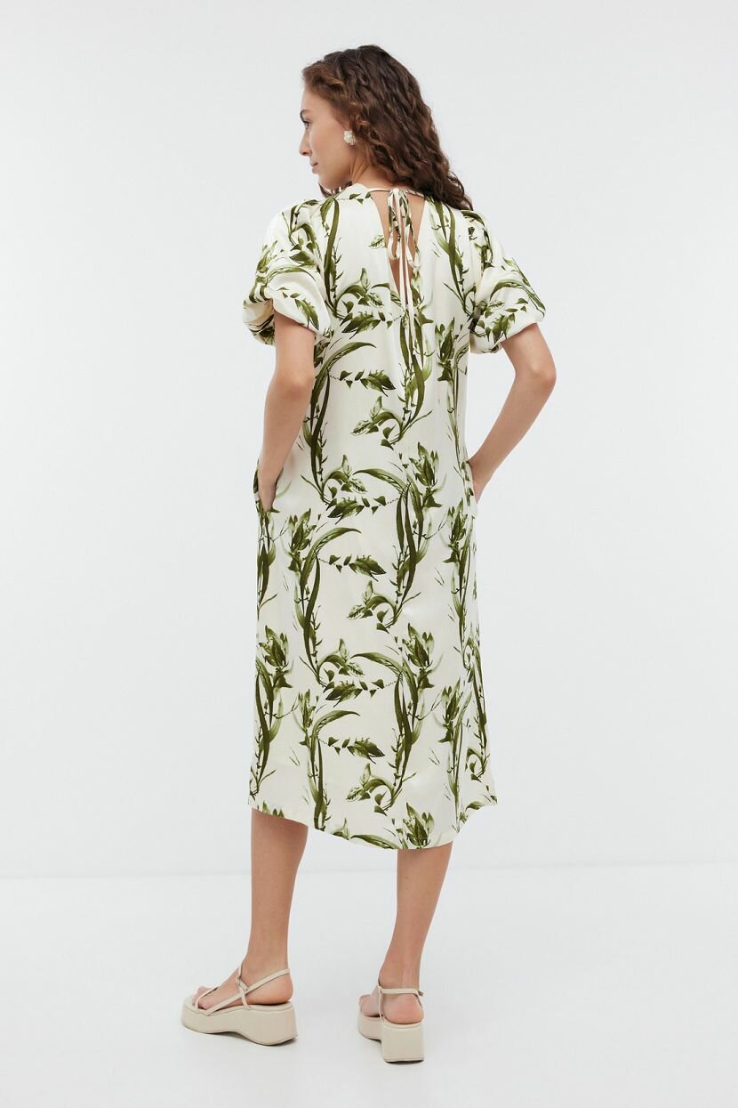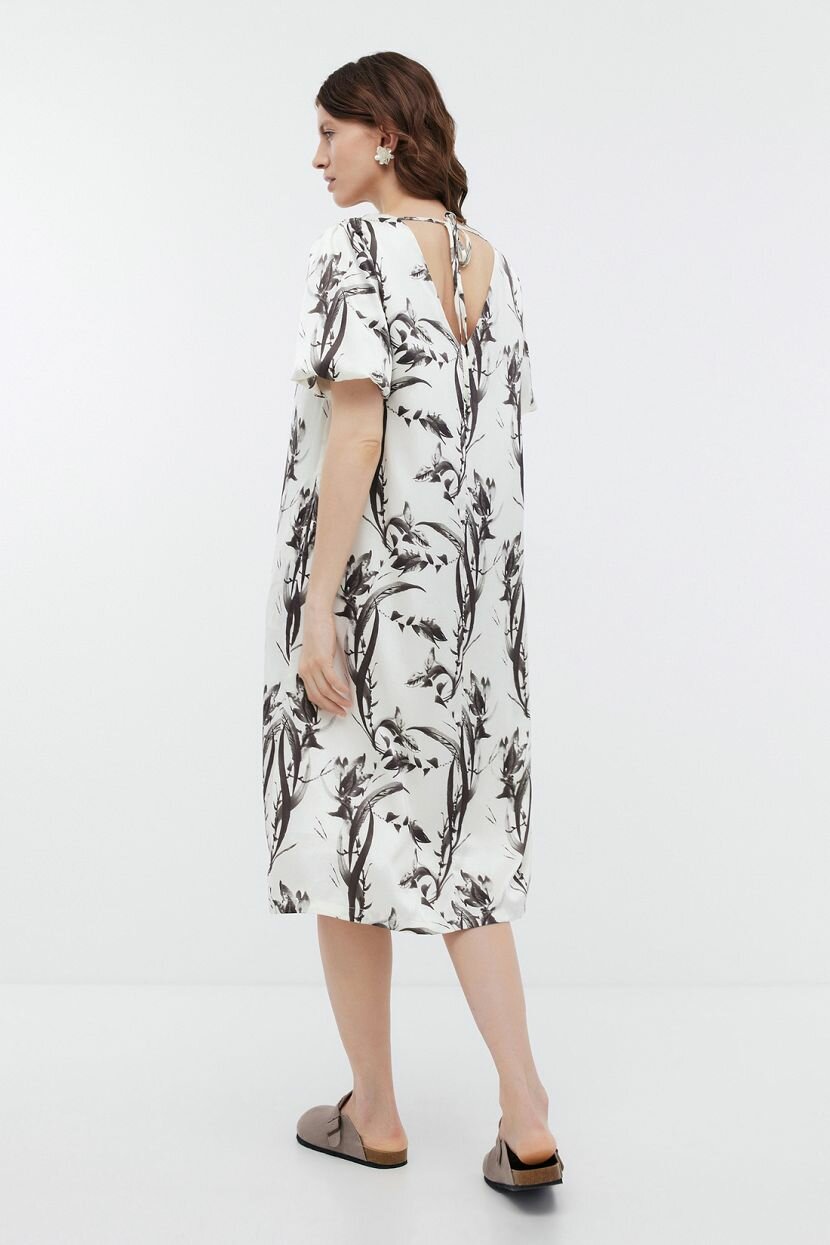 Платье свободного силуэта - красивое лаконичное дополнение базового гардероба. Оно уместно как на каждый день, так и для особенных случаев, поскольку вносит в образы ноты непринужденности и расслабленности. Удобная посадка по фигуре обеспечивает ощущение раскованности. Декор в виде принта с флоральными мотивами органично дополняет аутфиты вне зависимости от стилистики. Такой рисунок выступает одним из главных модных трендов. Модель миди дополнена объемными короткими рукавами. Вырез с завязкой на спинке гармонично сочетается с V-образной формой декольте. Эти элементы кроя подчеркивают женственность и утонченность. Изделие выполнено из плотного сатина с безупречно гладкой фактурой. Мягкий приятный к телу материал дарит тактильный комфорт.