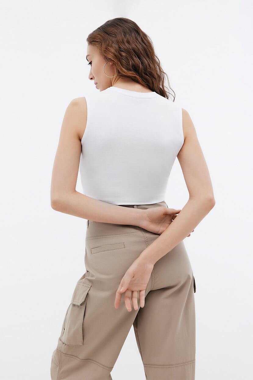 Кроп-топ - женственная базовая модель, которая должна быть в современном гардеробе на каждый день. Будет уместен в повседневных и спортивных луках. Он украсит вечерний и уличный аутфит. Облегающий силуэт красиво садится по фигуре, выделяя контуры тела. Крой не сковывает движений и позволяет ощущать себя раскованно. Лаконичный дизайн топа украшает драпировка. Отсутствие декоративных деталей и монохромное цветовое решение дают возможность безгранично стилизовать его. Круглый вырез горловины окантован. Укороченный топик выполнен из плотного хлопкового джерси. Материал с гладкой приятной фактурой отлично пропускает воздух. Эластан увеличивает эластичность и прочность. Изделие сохраняет презентабельный внешний вид и форму после многократных циклов стирки.