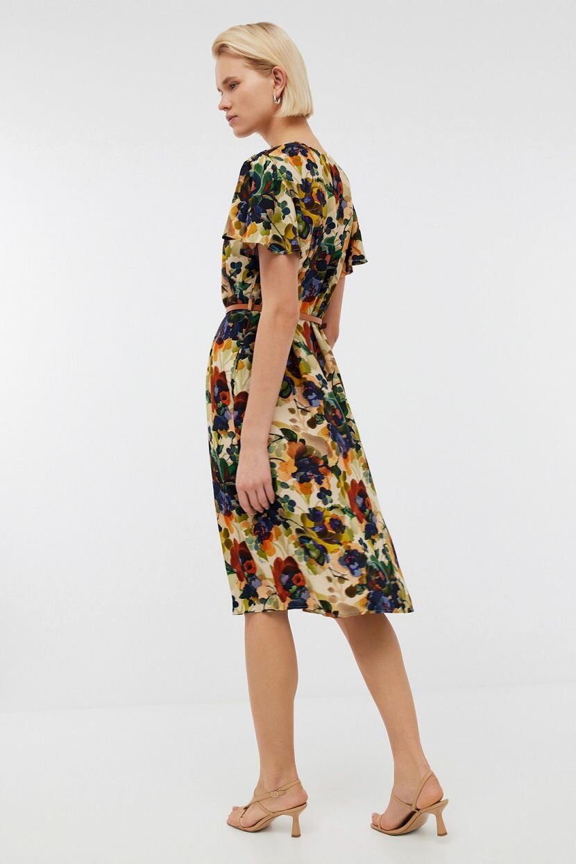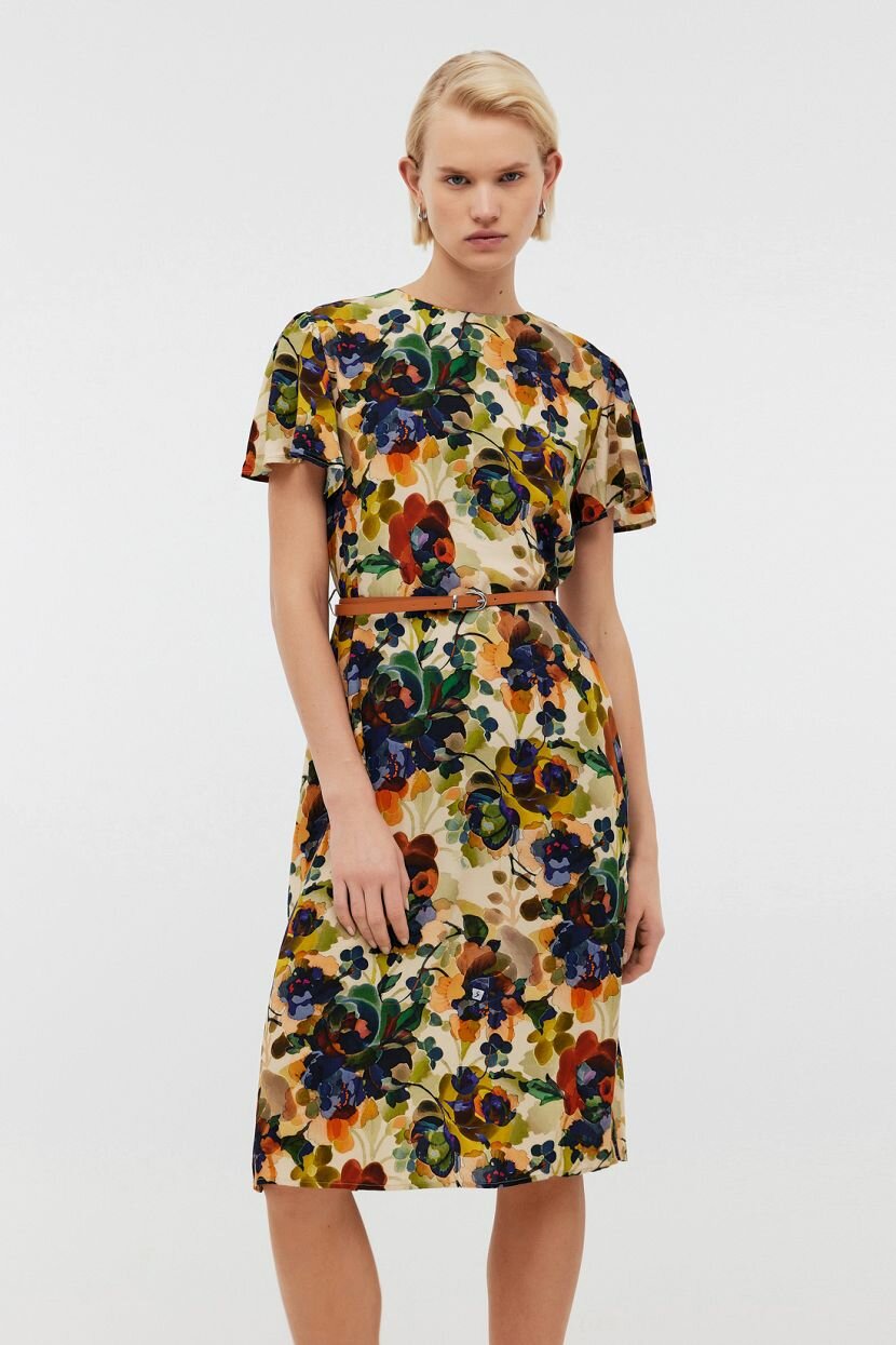 Платье удлиненное с принтом в стиле батик - модное решение, чтобы создать образ романтичной и утонченной женщины или девушки. Оно станет актуальным акцентом лука для офиса. Может быть интегрировано в многослойные комплекты. Цветочный рисунок является стильным трендом, который уместен в повседневных аутфитах. Элегантная модель миди с круглой горловиной обладает летящим силуэтом, который органично продолжают короткие расклешенные рукава. Тонкий пояс с пряжкой по линии талии корректирует посадку по фигуре и гармонизирует пропорции. Изделие дополнено застежкой по спинке на пуговицу. Выполнено из фактурной вискозы. Она практически невесомая и мягкая на ощупь. Благодаря дышащим свойствам материал приятно охлаждает кожу и дарит тактильный комфорт.