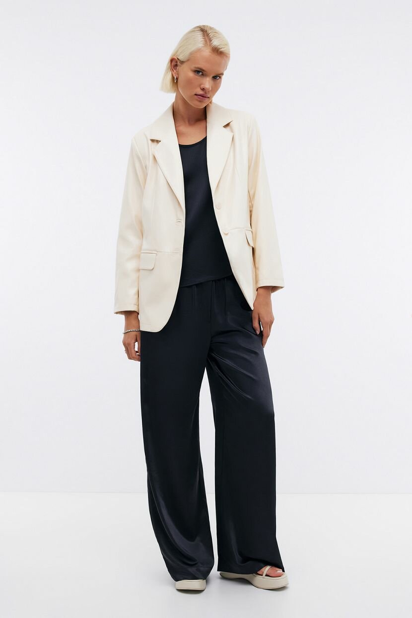 Лаконичный топ может стать как базовой, так и акцентной составляющей аутфита. Она самодостаточна, но в то же время может служить частью многослойного комплекта. Монохромное цветовое решение облегчает интеграцию в деловые и повседневные образы. Свободный крой красиво садится по фигуре, ненавязчиво подчеркивая контуры. Удобство движений делает модель прекрасным вариантом для длительного ношения в течение дня. В качестве трендового элемента использована американская пройма с окантовкой, открывающая лопатки и ключицы. Она уравновешивает силуэт и придает расслабленную роскошь. Благодаря оптимальной длине, можно носить навыпуск и заправлять, получая разнообразные луки. Майка выполнена из фактурной ткани с атласным блеском, который притягивает внимание при любом освещении. Легкий приятный к телу материал комфортен при соприкосновении с кожей.