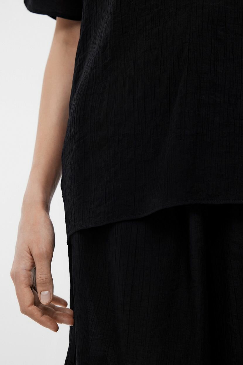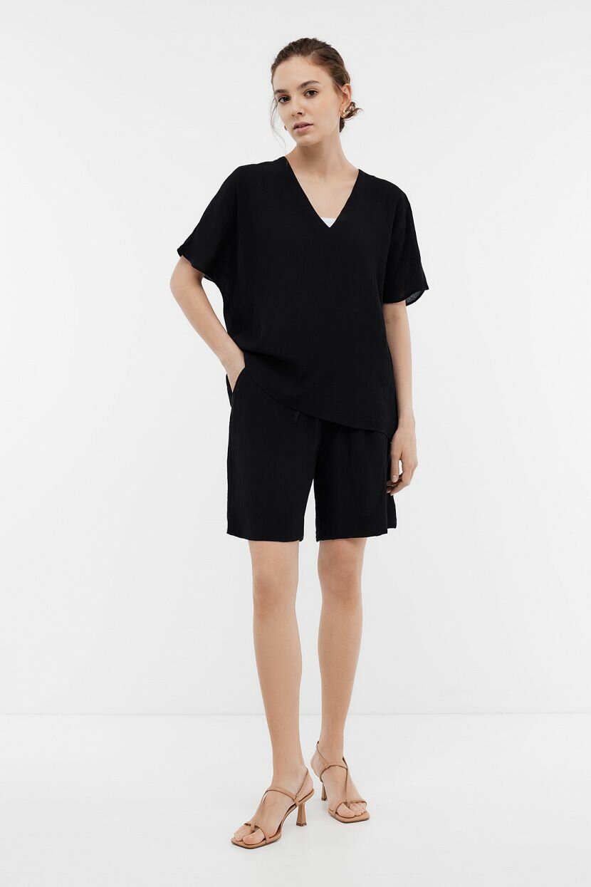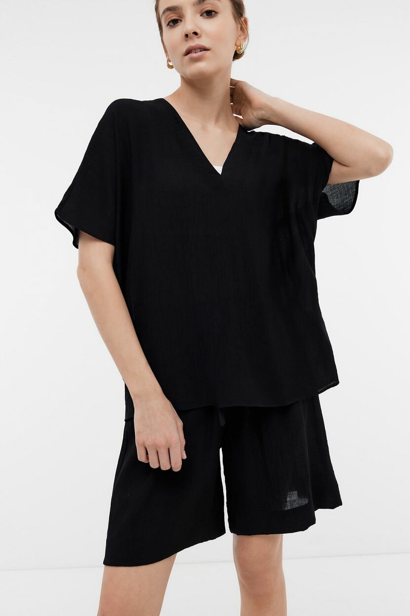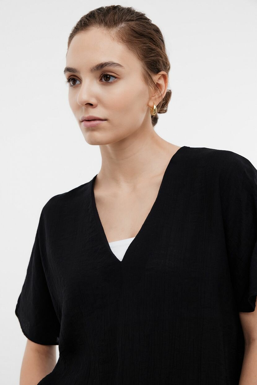 Стильная женская блузка с коротким рукавом позволяет собрать неформальный повседневный образ. Она освежает офисный комплект и будет хорошо смотреться в романтическом стиле. Изделие органично дополнит комбинации и станет акцентом лука. Модный аутфит в монохромных оттенках не будет выглядеть строго благодаря расслабленности силуэта. Свободный прямой крой дополняет глубокий V-образный вырез, придающий выразительность. Блуза выполнена из струящегося материала из вискозы с мятым эффектом. Он обладает дышащими свойствами и гигроскопичен. Для дополнительного комфорта был добавлен полиамид, который увеличивает растяжимость ткани. Простота ухода и малая сминаемость - важные преимущества при активной носке.