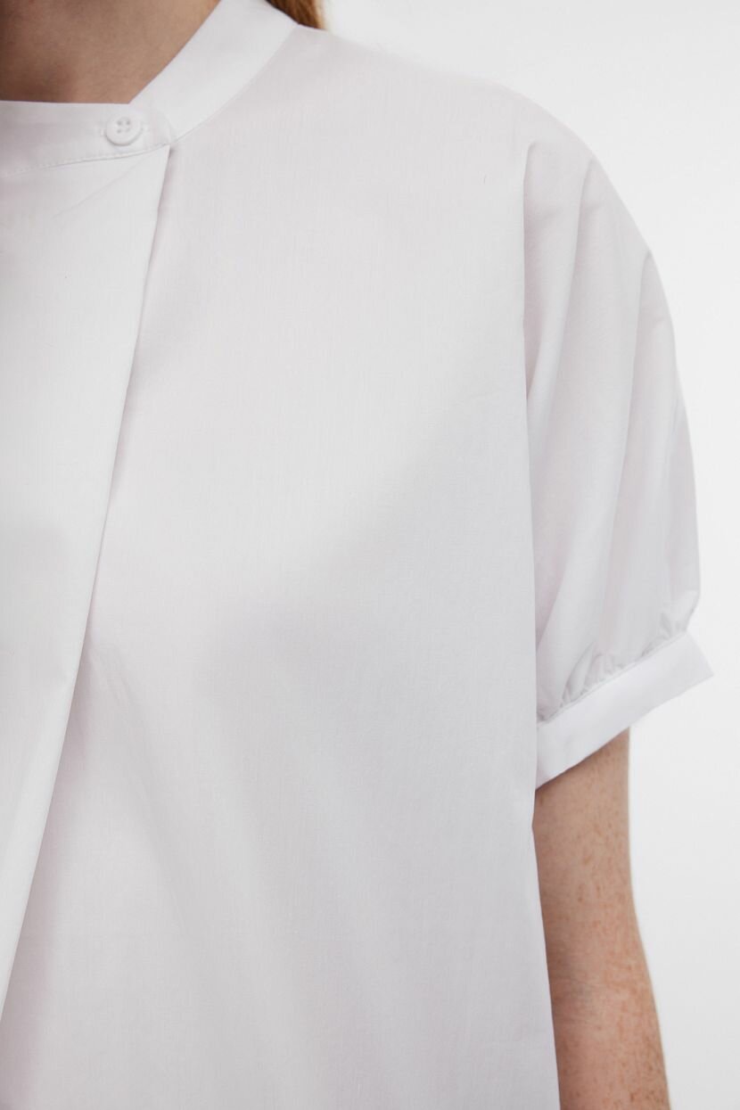 Белая блузка - универсальная вещь в женском гардеробе. Она служит достойной базой для стилистических экспериментов. Ее можно включить в деловой или романтичный образ. Стильные аутфиты на каждый день удобны и практичны. Однотонная блуза до середины бедра асимметричного кроя создает женственный силуэт. Воротник-стойка застегивается на пуговицу. Далее линию поддерживает фальш-застежка, расположенная на лицевой стороне. Короткие рукава завершают манжеты с отворотами. Они в меру объемные. Активные и утонченные девушки по достоинству оценят удобство хлопкового поплина. Дышащий натуральный материал обладает гладкой приятной к телу фактурой. Он гигроскопичный и прочный. Полиамид и эластан сохраняют внешний вид без деформаций долгое время.