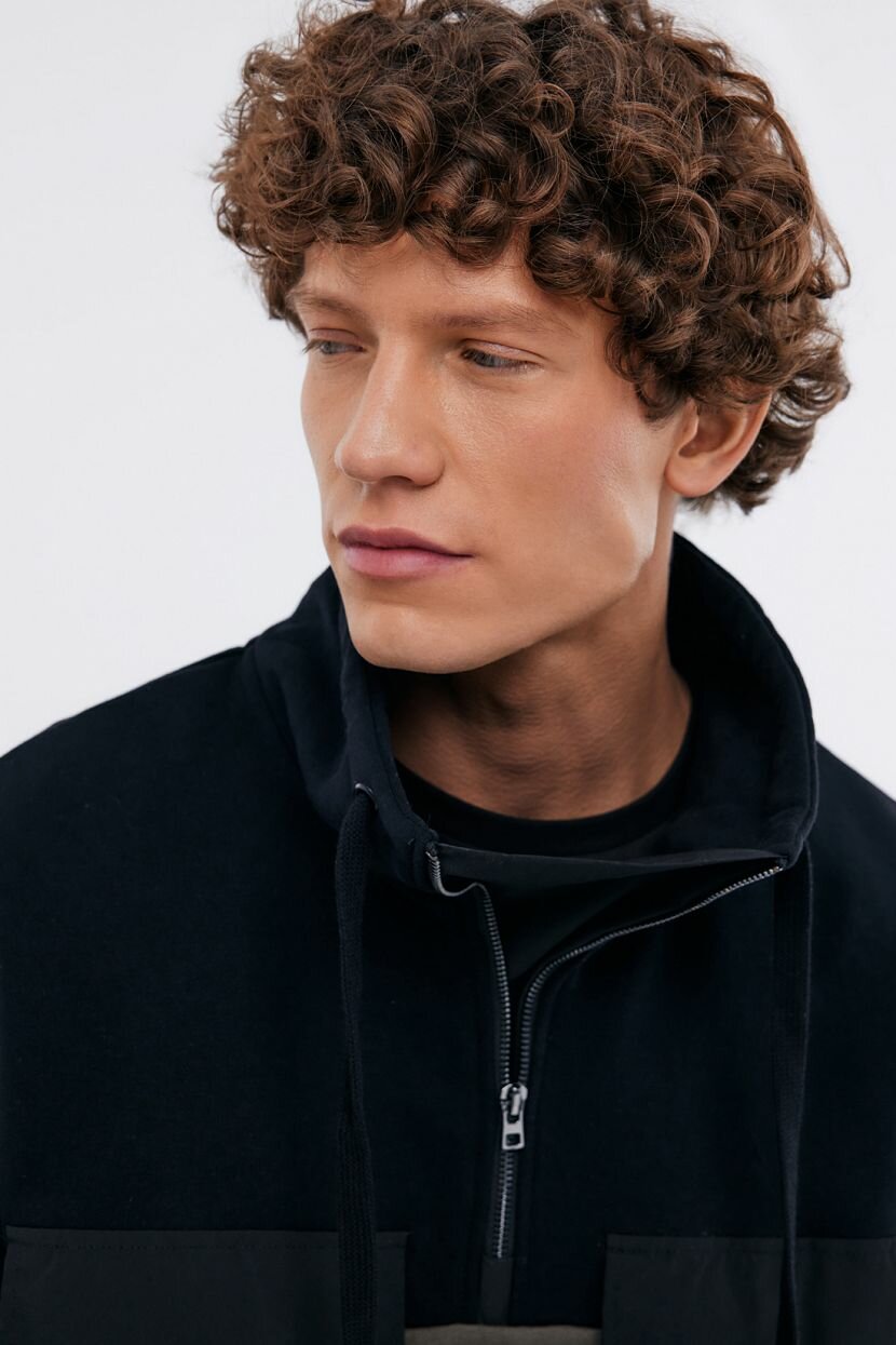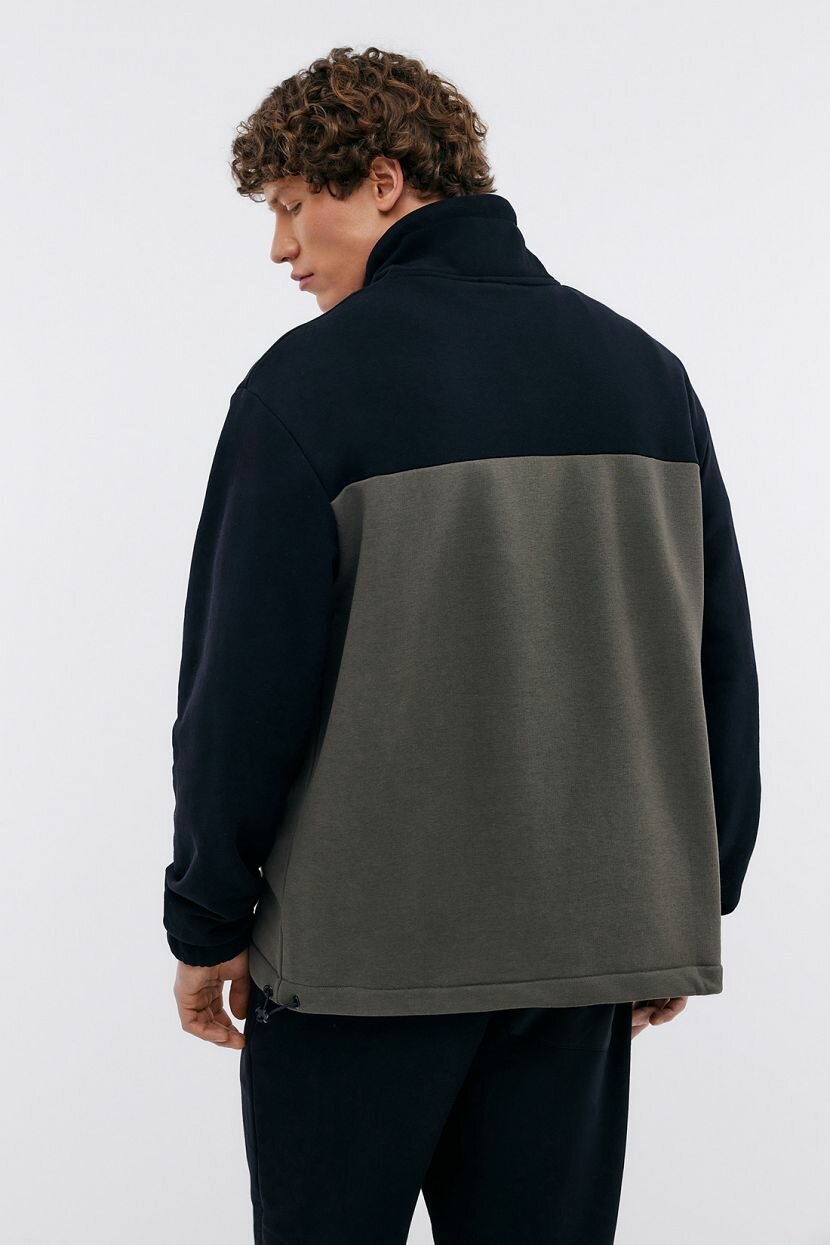 Комбинированная толстовка - удобная и свободная одежда на каждый день. Функциональный крой не сковывает движений. Объемный оверсайз силуэт гармонично садится по фигуре вне зависимости от комплекции. Ее модный дизайн притягивает взгляды. В качестве стильного декоративного приема использовано сочетание крупных цветовых блоков. Накладные карманы с клапанами на груди и воротник-стойка из плащевой ткани служат оригинальной отделкой. Ворот защищает в ветреную погоду и увеличивает комфорт. Он утягивается шнурком для комфортного прилегания. Изделие застегивается на короткую молнию. Утяжка по низу регулирует ширину и позволяет сохранить тепло внутри. Кофта с длинным рукавом выполнена из хлопкового футера без начеса. Трикотаж теплый и мягкий на ощупь. Полиэстер в составе материала предотвращает деформацию и повышает прочность полотна.