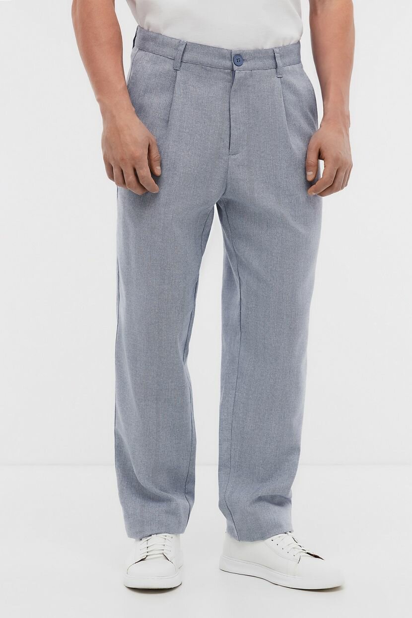 Брюки мужские органично интегрируются в кэжуал стилистику и сочетаются с повседневными или спортивными базовыми вещами. Уместны в деловых аутфитах для офиса и переговоров. Однотонные чинос корректируют фигуру и выделяют достоинства. Стильная универсальная модель имеет среднюю посадку зауженный к низу силуэт. Она обладает декоративными складками у пояса, что придает выразительность. Предусмотрены шлевки и функциональные карманы: боковые спереди и прорезные сзади. Застегиваются на пуговицу. Изделие выполнено из легкого дышащего полотна, в состав которого входят хлопок и лен. Оно дарит тактильный комфорт при соприкосновении с кожей. Характерная структура материала "елочка" выглядит эффектно. Добавление полиэстера увеличивает прочность и износостойкость ткани.