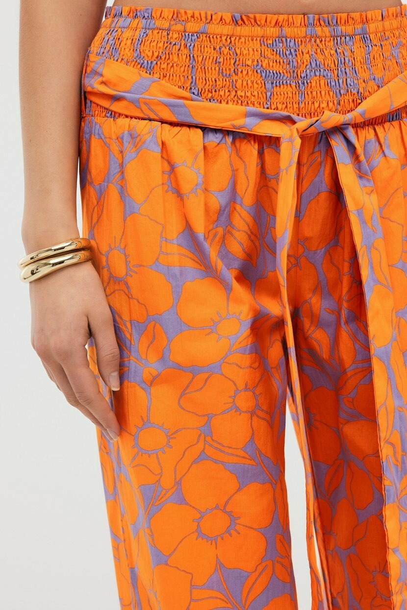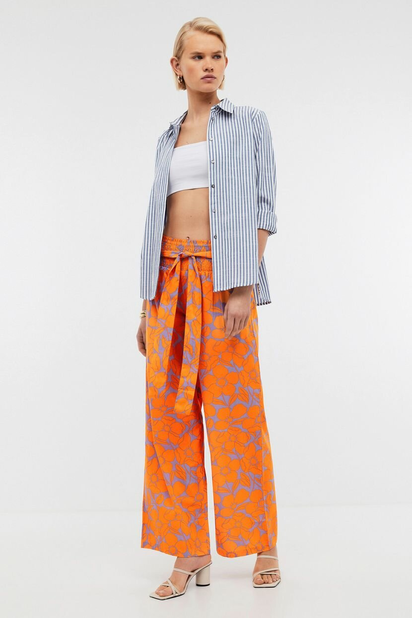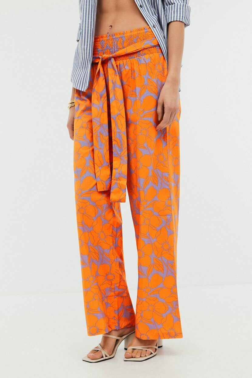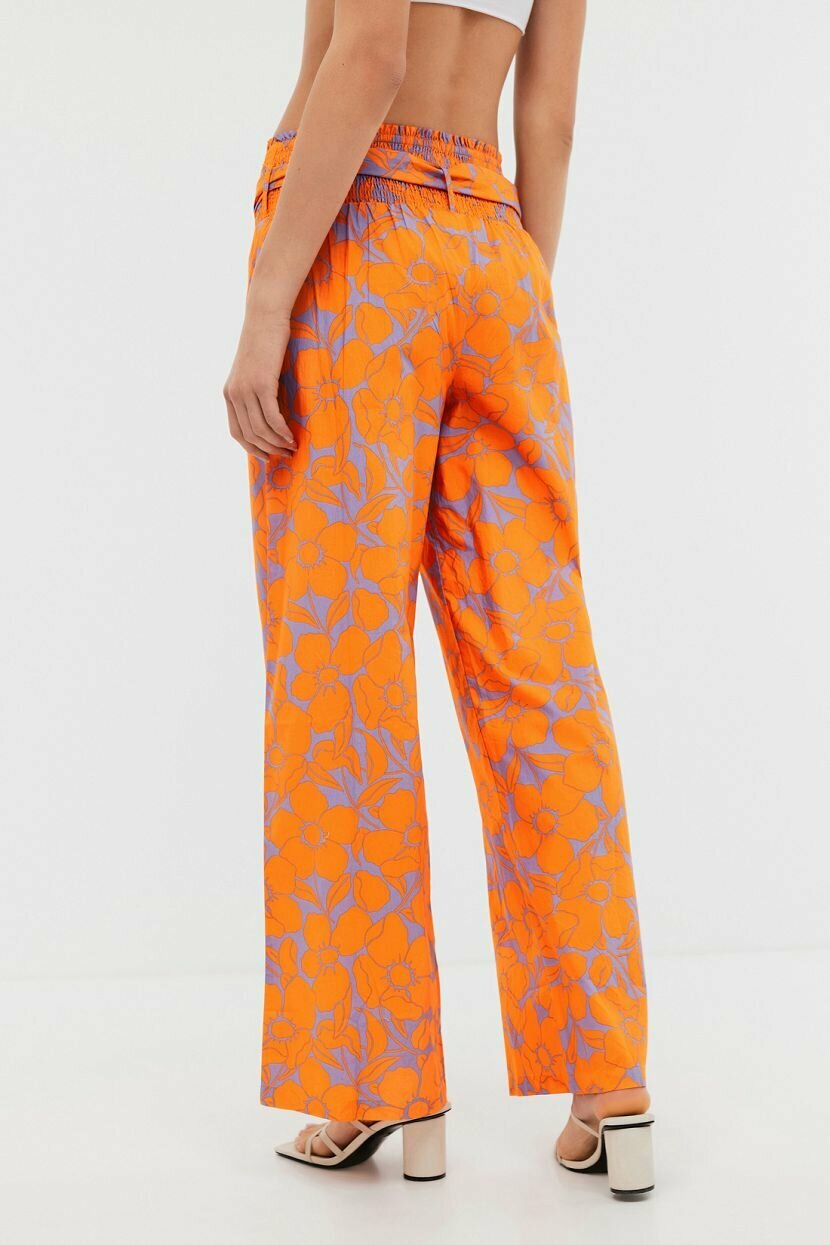 Яркие экстравагантные женские брюки станут основой незабываемых образов. Они подойдут для неформальных повседневных аутфитов для любого случая жизни. Свободный силуэт и прямой крой гармонично смотрятся и подчеркивают достоинства. Они обладают высокой посадкой, которая гармонизирует пропорции. Благодаря эластичному поясу-кокетке комфортно фиксируются на талии. Удобство и свобода движений будут неотъемлемыми спутниками. Съемный поясок из основного полотна дополняет модель. На материал нанесен насыщенный принт с цветочным интересным орнаментом, который точно запомнится и позволит выделиться. Изделие выполнено из хлопковой ткани. Его мягкость и гладкость обеспечивают комфорт ношения в течение целого дня. Натуральный хлопок отлично держит форму и не требует специального ухода.