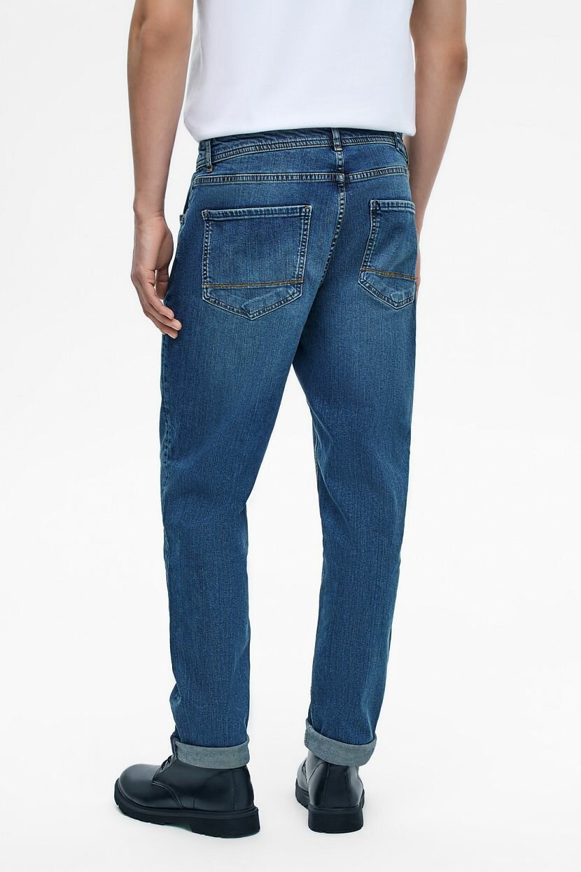 Облегающие фигуру джинсы SLIM FIT - модель для стильных и уверенных в себе. Средняя по высоте посадка обеспечивает комфорт движения. Джинсы имеют классический пятикарманный крой с застёжкой на молнию и фирменную пуговицу-болт. Передние карманы дополнительно усилены металлическими клёпками. Пояс дополнен шлёвками для ремня. Джинсы выполнены из плотного денима с эффектом потёртости и винтажной обработкой швов. В составе натуральный хлопок - дышащий, мягкий и гипоаллергенный. Небольшое содержание эластана повышает износостойкость изделия и заботится о сохранности его формы в процессе носки.