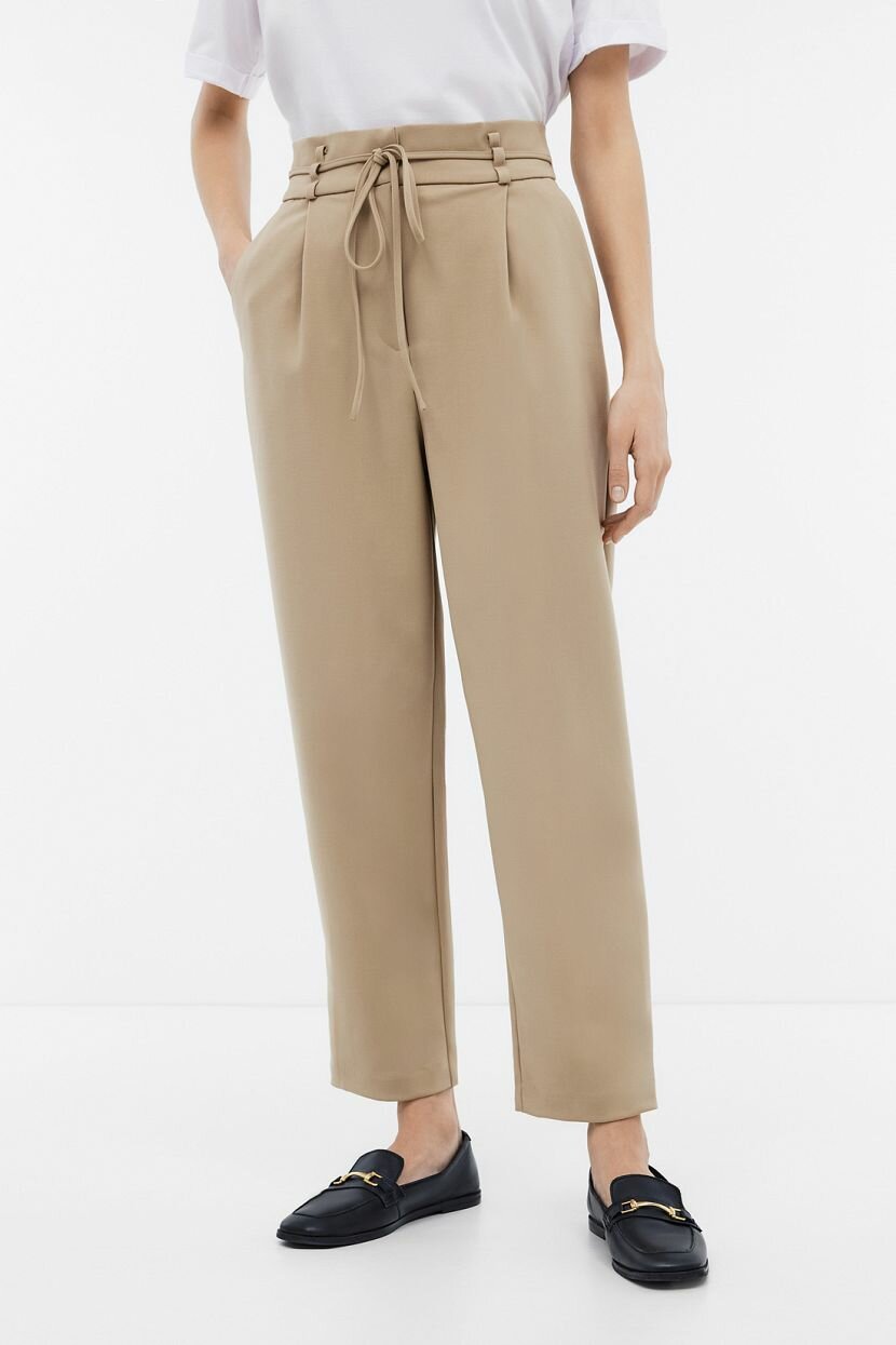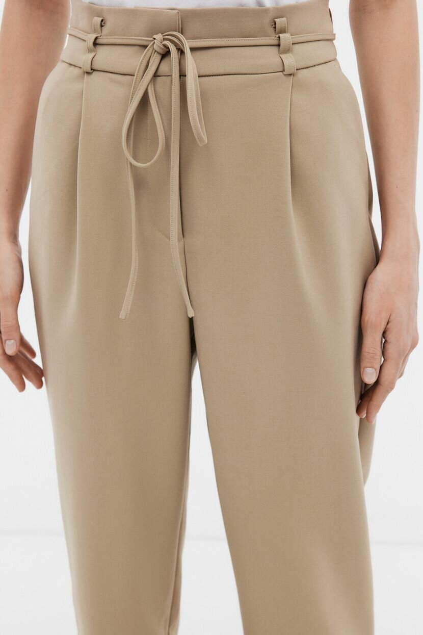 Брюки с высокой посадкой - лаконичный вариант, который способен дополнить повседневные и деловые образы. Они подчеркивают женственность и гармоничные пропорции фигуры. Зауженный к низу силуэт визуально удлиняет ноги. Широкий пояс с петлями ставит акцент на талии. В качестве декоративного элемента служит тонкий ремешок из основного полотна. Предусмотрены карманы в боковых швах и прорезные - сзади. Застежка на потайные крючки удобна. Монохромное цветовое решение в стильном бежевом оттенке органично сочетается с базовыми составляющими гардероба. Модель выполнена из плотной костюмной ткани, в состав которой вошли вискоза с добавлением полиэстера и эластана. Материал сохраняет цвет и не растягивается, поэтому вещь прослужит долго. Он обладает дышащими свойствами и приятен на ощупь. В комплект к брюкам подойдет жакет арт. B1224001, но вы также сможете сочетать их с разными моделями.