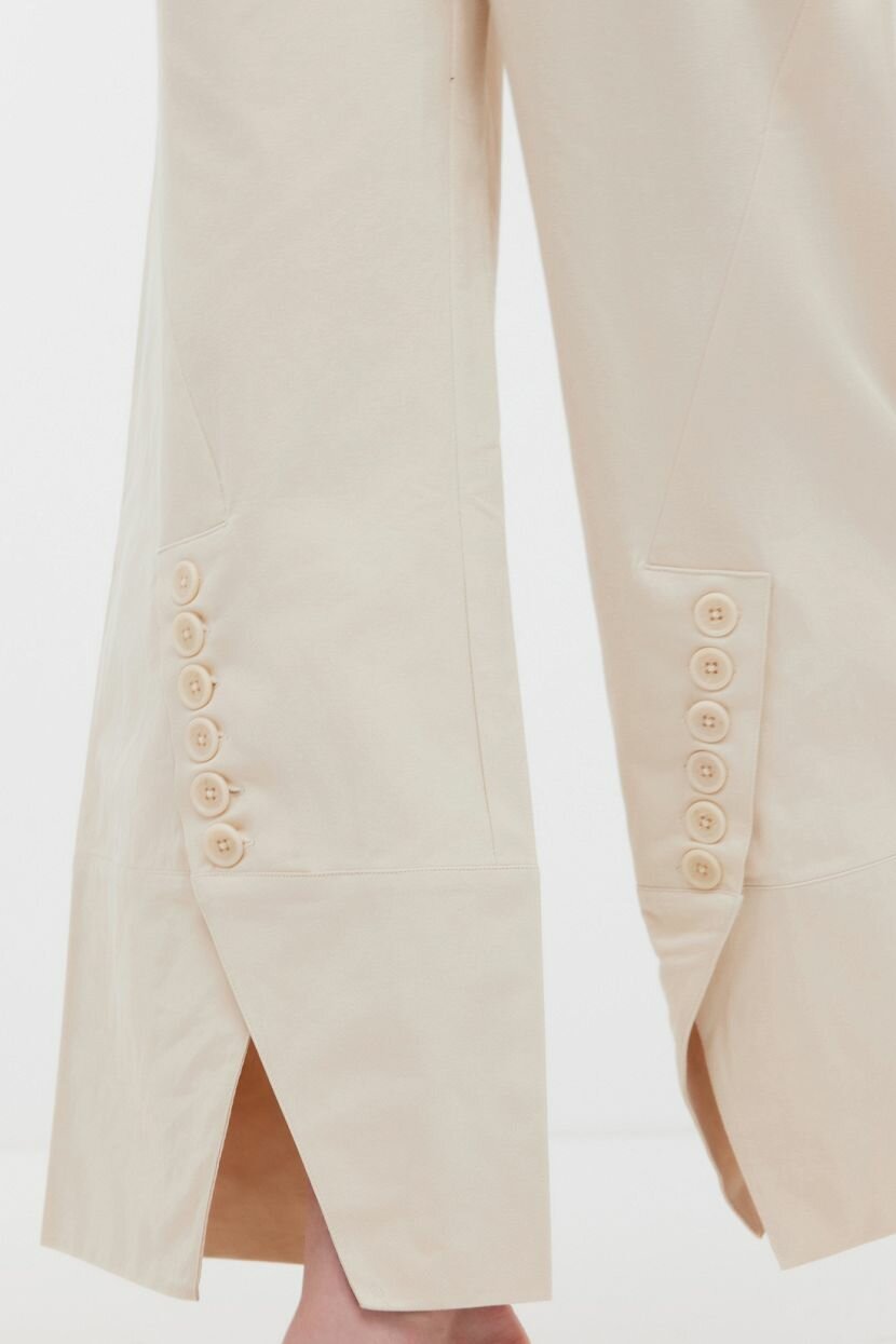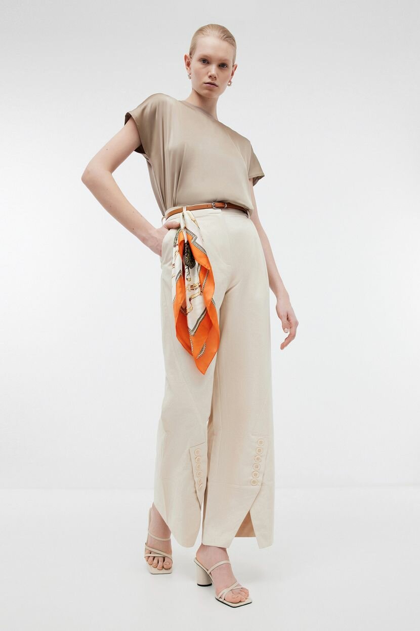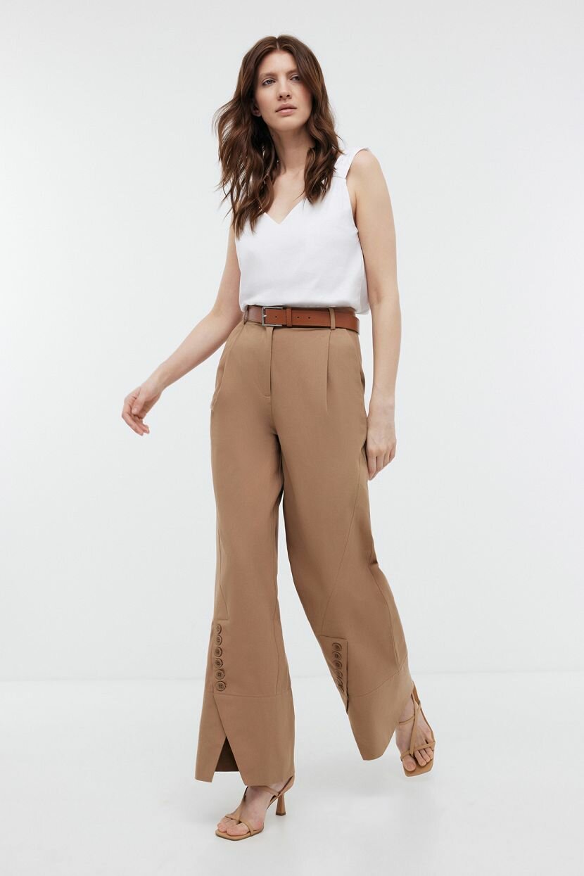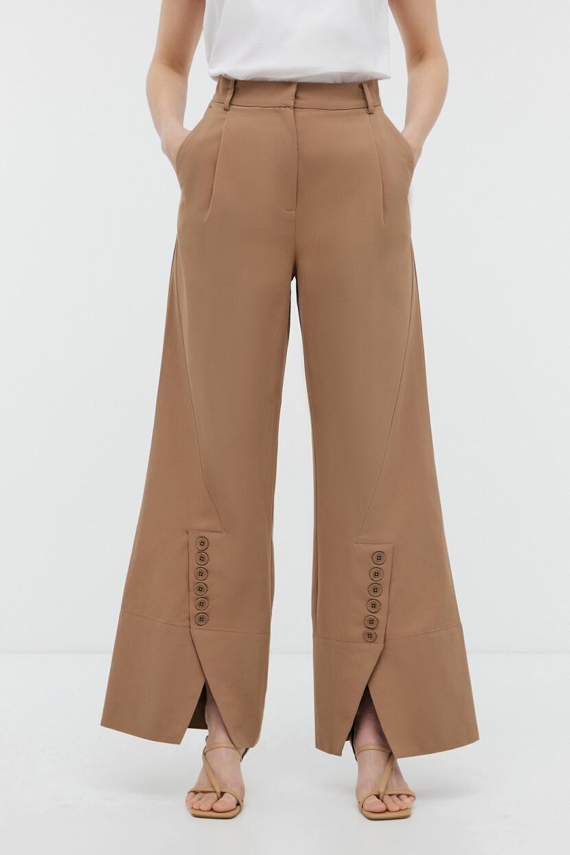 Широкие брюки классические - основа женского гардероба, которая возвращается в модные тренды. Прямая однотонная модель родом из 70-ых годов, вновь завоевывает сердца модниц. Гармонично сочетается с базовыми вещами в повседневном и деловом стиле. Ее можно внедрить в кэжуал и офисную капсулу для любого сезона и наслаждаться безупречным внешним видом. Силуэт WIDE LEG подходит для любого типа фигуры. Красивая посадка демонстрирует достоинства. Удобный крой не сковывает движений и дарит уверенность в каждом шаге. Декоративные подрезы с пуговицами - эффектная изюминка, которая выгодно отличает изделие от аналогов. Выполнены из плотного структурного хлопка, который обладает дышащими свойствами и обеспечивает комфортную терморегуляцию. Материал сохраняет форму и устойчив к пилингу.