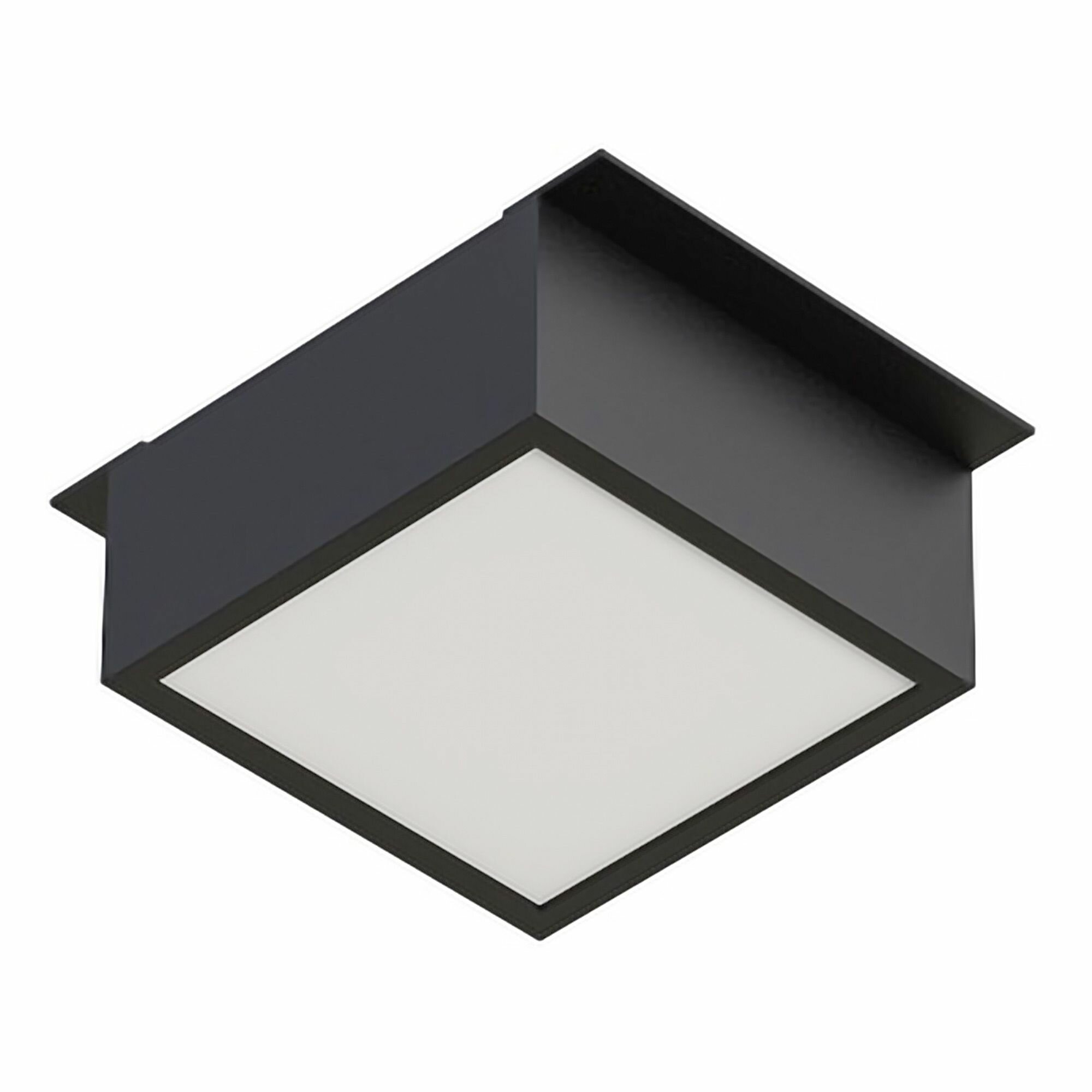 Встраиваемый светильник даунлайт для установки в потолки Грильято с размером ячейки 100х100 мм и высотой направляющих 30, 40 или 50 мм. Мощность 6 Вт, св. поток 570 лм, 95 лм/Вт, тёплый 3000 K, CRI>80, угол 90°, напряжение питания 230 В. Чёрный квадратный корпус из алюминия, степень защиты IP40. Размер: длина 90 мм, ширина 90 мм, высота 40 мм. Монтаж встраиваемый, установочное отверстие: длина 90 мм, ширина 90 мм. Пульсация