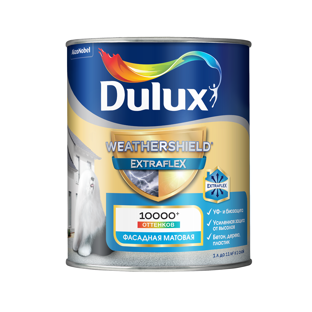 Матовая акриловая краска для фасадных работ. Образует высокоэластичное покрытие, устойчивое к растрескиванию. Обладает улучшенной адгезией к большинству строительных материалов (минеральные, деревянные и пластиковые поверхности). Препятствует появлению высолов на окрашенной поверхности, содержит активные и силиконовые добавки для усиленной защиты от влаги, грязи, грибка и водорослей. Краска не имеет резкого запаха, обладает отличной укрывистостью, легко наносится без разбрызгивания и потеков.Область применения:Подходит для нанесения на полностью просохшие минеральные поверхности (бетон, штукатурка, кирпич, каменная кладка), виниловый сайдинг, декоративные фасадные панели из ПВХ, доски ДПК, деревянные поверхности. Идеально подходит для цоколей.Свойства:в 5 раз эластичнее, чем другие фасадные краски Dulux;срок службы покрытия до 15 лет;усиленная защита от высолов;защита от УФ-излучения и биозащита;надежная защита от влаги и грязи;подходит для бетона, дерева, пластика.Подготовка поверхности:Перед применением очистите поверхность от влаги и грязи. Обычное распыление: разбавить в соотношении не более 1 части воды на 5 частей краски — подходит для большинства оборудования. Безвоздушное распыление: разбавление водой не требуется. При необходимости добавить до 10% воды. Рекомендуемое рабочее давление от 100 до 150 бар, угол распыла факела 30-50°, диаметр сопла 0,012-0,017 дюйма. Разбавление: не более 1 части воды на 10 частей краски.Нанесение продукта:Тщательно перемешайте. Наносите в 2 слоя при температуре воздуха и поверхности от +5°C до +30°C, и влажности от 40% до 80% кистью из синтетической щетины, валиком для водно-дисперсионных фасадных красок, или методом распыления. При окраске больших площадей рекомендуется использовать метод распыления. После завершения работ тщательно очистите инструменты от краски и промойте водой.Уход за окрашенной поверхностью: избегайте мытья и интенсивной очистки свежеокрашенной поверхности. Через месяц после покраски поверхность устойчива к мытью с использованием мягких моющих средств (раствор мыла, геля для душа, шампуня). Возможно небольшое изменение блеска покрытия. Не оставляйте поверхность мокрой.Условия транспортировки и хранения:Срок хранения 4 года при температуре от +5°С до +30°С в невскрытой заводской упаковке.