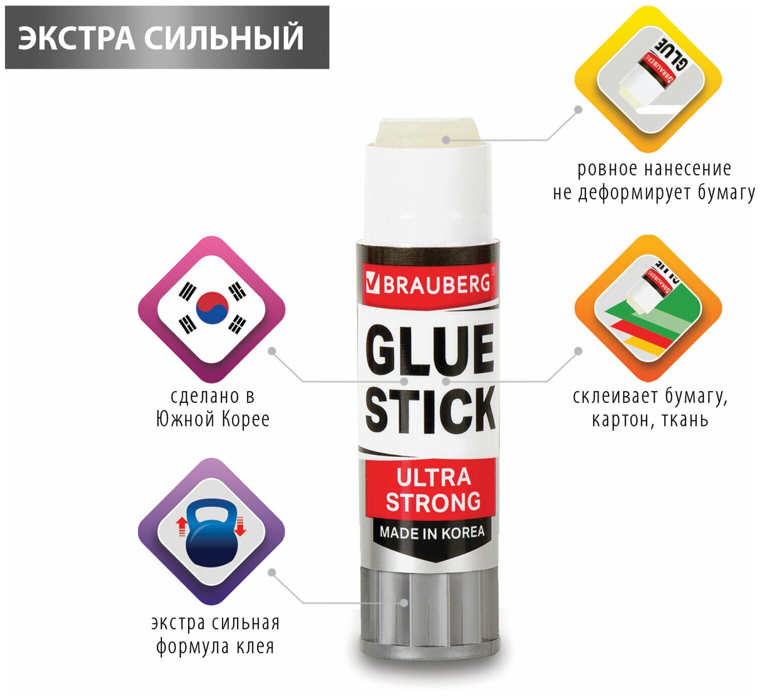 Клей-карандаш BRAUBERG ULTRA STRONG обеспечивает надежное склеивание бумаги, картона и фотобумаги. Идеально подходит для офиса, дома и школы.