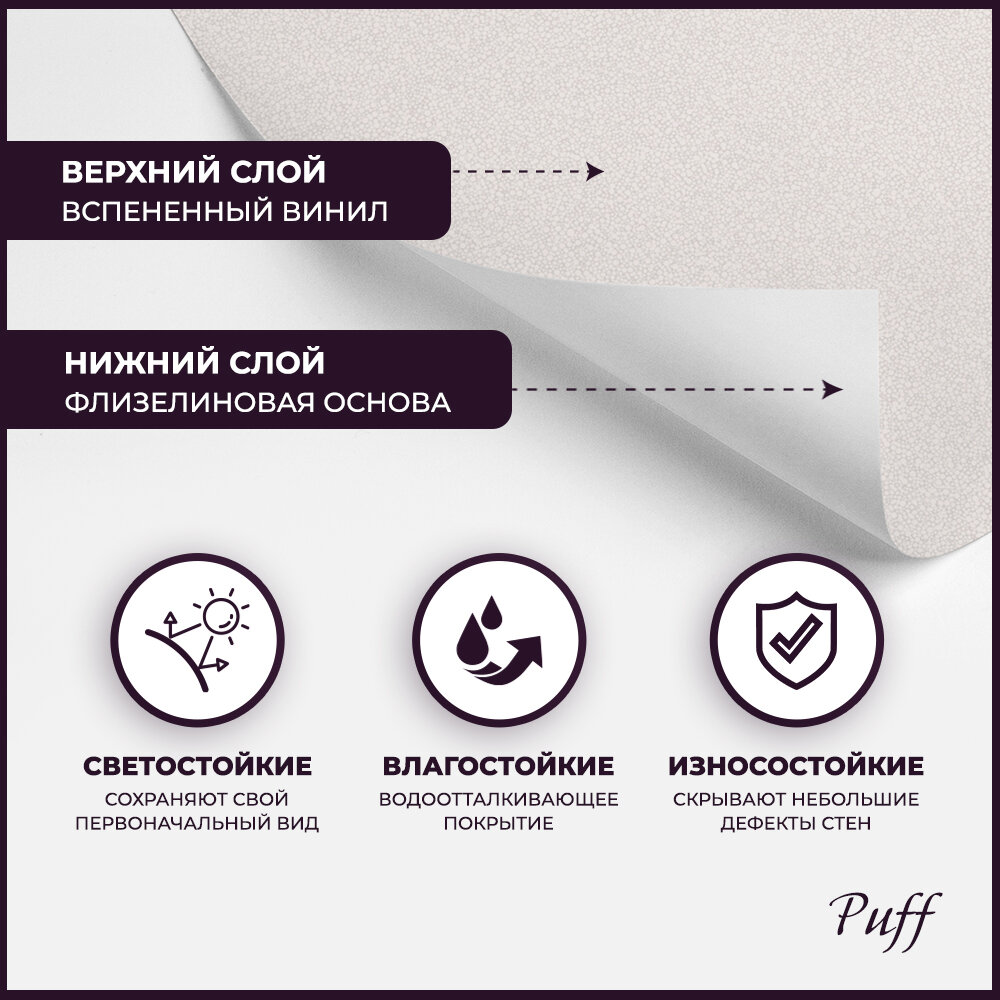 **Обои флизелиновые Anturage Puff** — изготовлены из целлюлозы и синтетических волокон. Они обладают рядом преимуществ: не деформируются, не выцветают, устойчивы к влаге и грибку, легко клеятся и снимаются со стены. Флизелиновые обои также имеют антистатическое покрытие, благодаря которому на них не оседает пыль. При необходимости рельефную поверхность можно протирать влажной губкой. Обои хорошо и без заломов ложатся на ровную поверхность. Если стена обеспылена и предварительно обработана грунтовкой, клей можно наносить только на обои. Подходят для сухих помещений и с умеренным уровнем влажности: любых комнат в доме или квартире, кухни, прихожей, гостиничных номеров, помещений общественного и административного назначения.