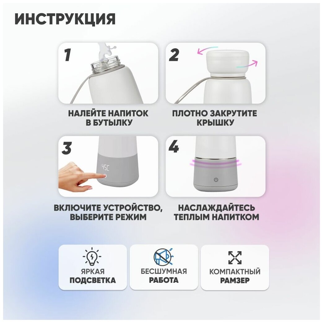 Емкость для подогрева жидкости уже входит в комплект, объем составляет 350 мл. Благодаря мощному аккумулятору 4500mAh, подогреватель может держать тепло до 6 часов, что делает его идеальным для использования в дороге и путешествиях.