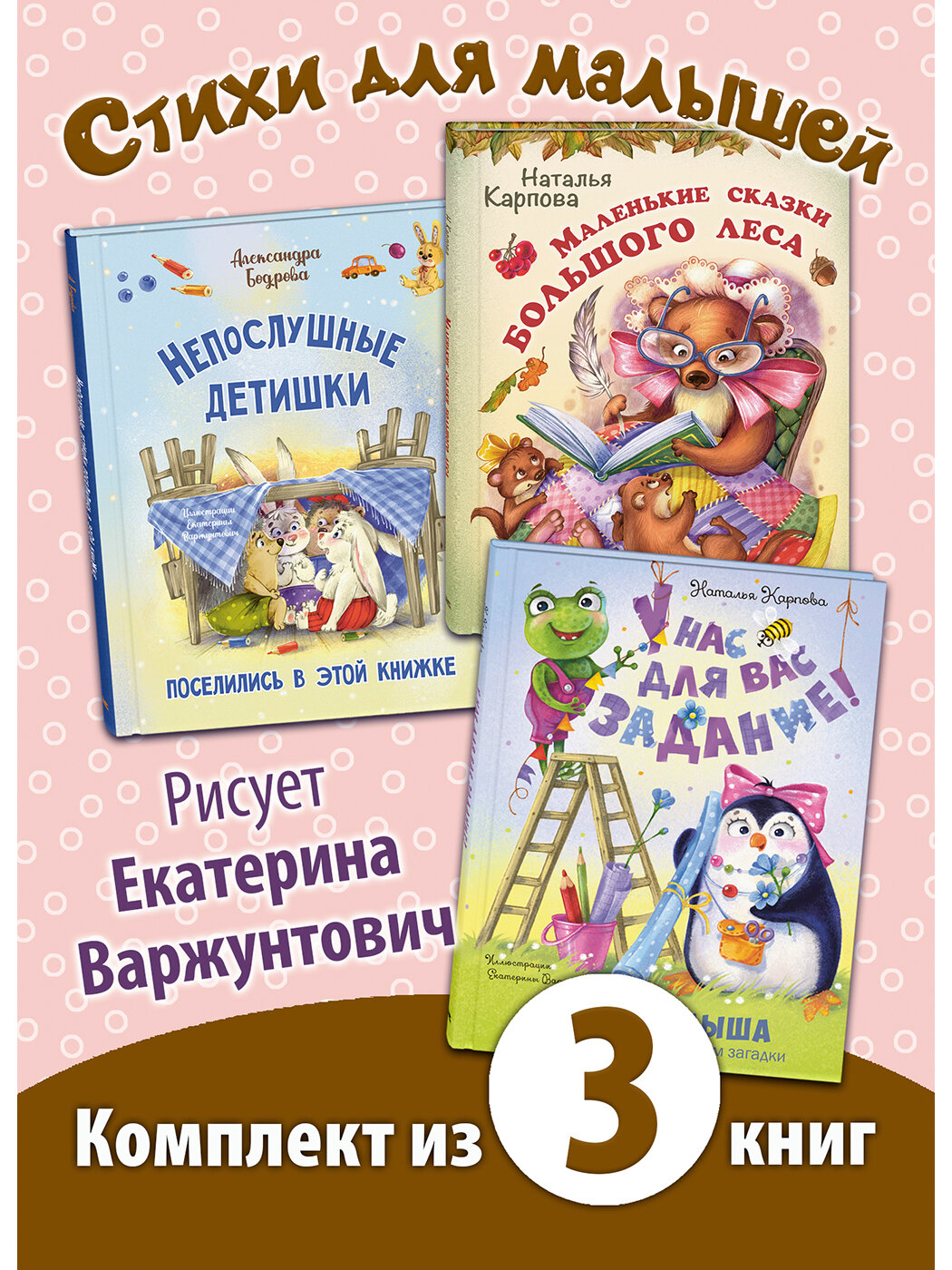 Теплые, жизнерадостные иллюстрации художницы Екатерины Варжунтович наполнены трепетной нежностью и волшебством. Она умеет создавать веселые образы людей и зверюшек такие, чтобы, глядя на них, читатель улыбался. В комплект входят разноплановые книги для малышей в стихах. Здесь найдутся и задания на внимательность и сообразительность, здесь бабушка Ласка открывает внукам лесные тайны, а в поучительных и забавных сказках про непослушных малышей каждый ребенок от трех до шести легко узнает себя. От этих книг так и веет детством и добром. Комплект состоит из трёх книг:1. Маленькие сказки большого лесаКого только ни встретишь в большом сказочном лесу! Там на деревьях, в кустах, на полянах обитают самые разные лесные жители! И порой с ними случаются очень забавные историиА бабушка ласка знает все эти истории и с радостью расскажет читателям маленькие сказки большого леса.2. Непослушные детишки поселились в этой книжкеПод обложкой этой забавной книжки живут озорная белочка Юля, привередливая мышка Соня, упрямый ослик Илья и многие другие Эти малыши часто шалят, капризничают и не слушаются старших. А что из этого получается, мы узнаем, прочитав весёлые и поучительные стихотворные истории об их проделках. Истории эти сочинила Александра Бодрова, а озорные иллюстрации к ним нарисовала Екатерина Варжунтович.3. У нас для вас задание!Под обложкой этой книги малыши найдут не только весёлые стихи популярного детского поэта Натальи Карповой, но и увлекательные задания на развитие внимания и сообразительности! А яркие и жизнерадостные иллюстрации к этой книге нарисовала Екатерина Варжунтович.