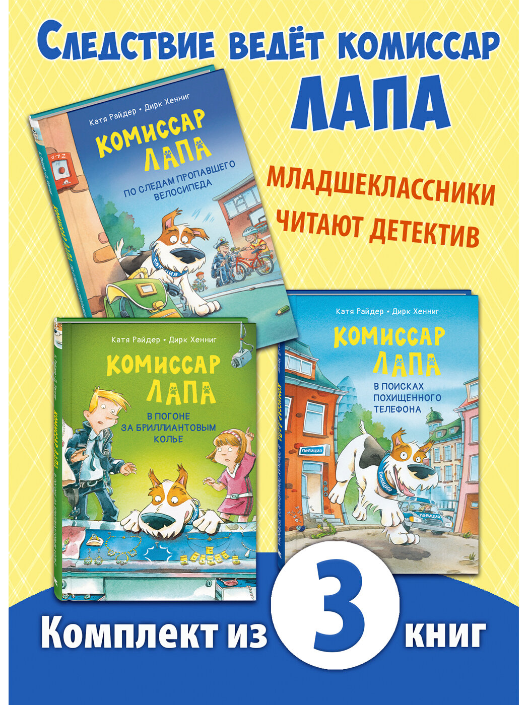 Полицейский Пауль и его верный четвероногий друг комиссар Лапа успешно ведут захватывающие криминальные расследования. Смекалка, наблюдательность, острый нюх и преданность хозяину помогают комиссару Лапе раскрывать самые запутанные дела. Книги придутся по душе младшеклассникам. В них увлекательный и понятный детям сюжет, удобный, крупный шрифт и веселые цветные иллюстрации. В комплект входят три книги:В поисках похищенного телефона;По следам пропавшего велосипеда;В погоне за бриллиантовым колье.