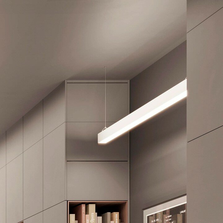 Подвесной профиль из анодированного алюминия с отсеком для блока питания (48,2х35,2 мм) с двусторонним свечением для создания эффекта «отраженного света» идеально подходит для основного освещения помещений.