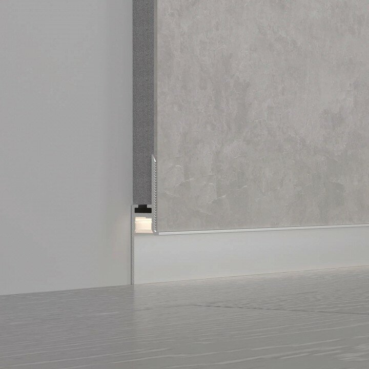 Встраиваемый профиль из анодированного алюминия для светодиодных лент и линеек под строительную отделку для создания эффекта парящей стены. Не является плинтусом, используется как декоративная накладка на фальш-стены.