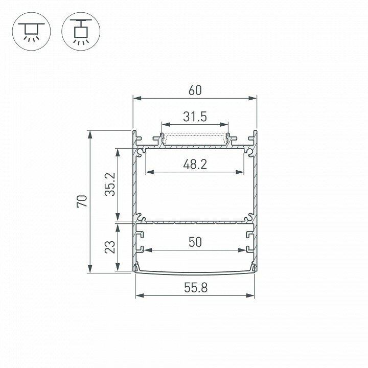 Габаритные размеры профиля составляют 3000 мм в длину, 60 мм в ширину и 70 мм в высоту. Площадки для установки светодиодных лент позволяют использовать ленты шириной до 50 мм и 31,5 мм (отраженный свет) и общей мощностью до 67 Вт/м. Это обеспечивает гибкость в выборе светодиодных лент и создает потрясающие световые решения.