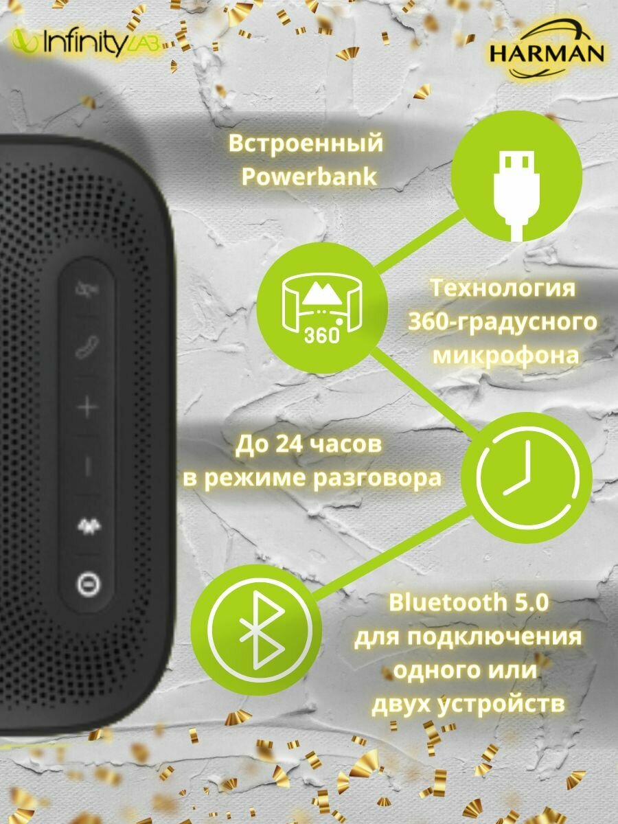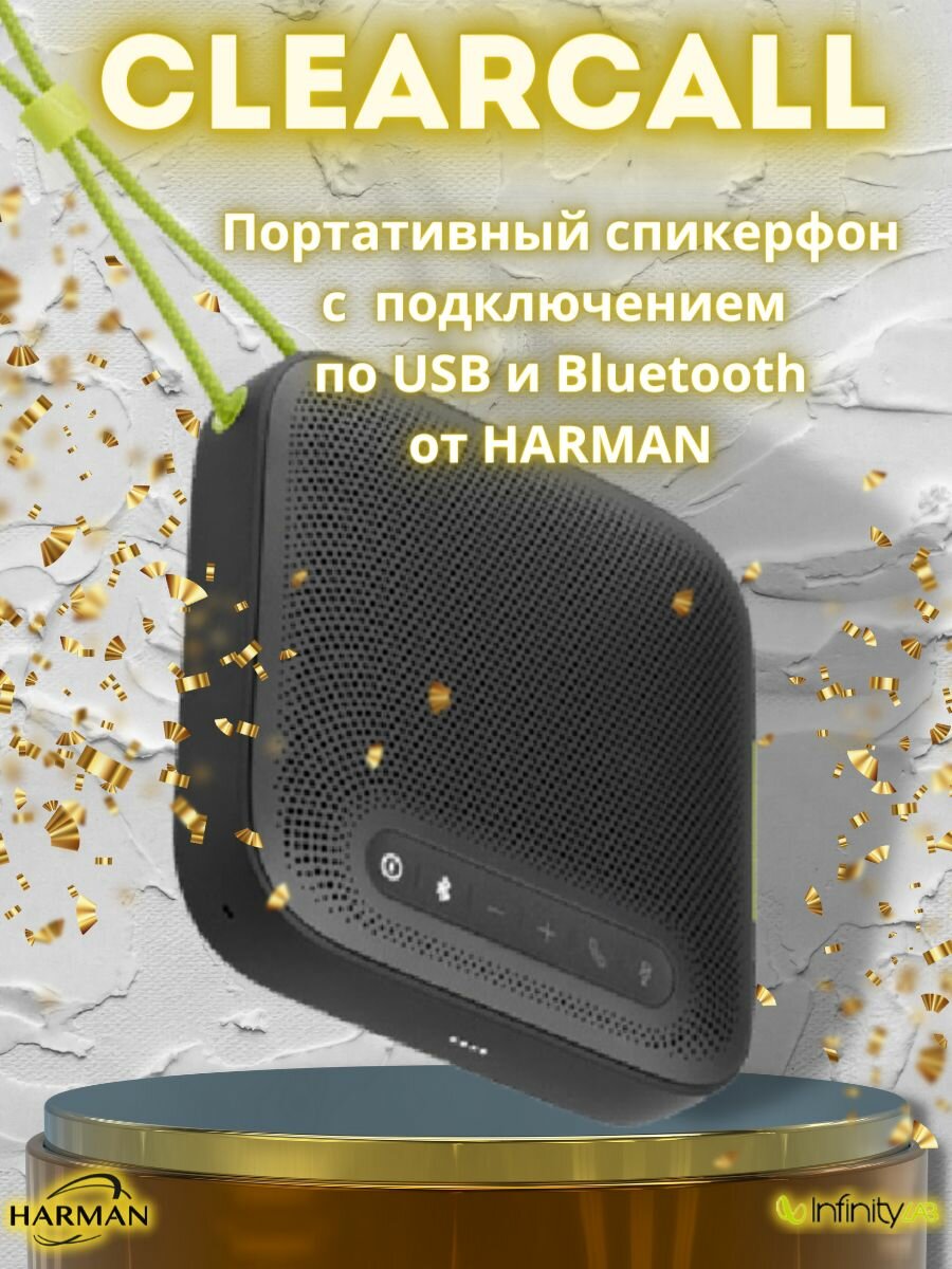 Портативная колонка с микрофоном ClearCall от Harman Kardon. Микрофон колонка идеально подходит для использования в качестве спикерфона для конференций ZOOM, Skype, Teems и других приложений. Эта акустическая система беспроводная и подключается к компьютеру, ноутбуку, планшету или смартфону по bluetooth. Но может служить как колонки для пк для компьютера по проводу через USB. Беспроводная колонка может быть использована как внешний аккумулятор (повербанк) для смартфона. Отчетливая слышимость, четкий звук. Работать за пределами офиса теперь проще, чем когда-либо, но вы все равно должны присутствовать на совещаниях. Использование динамиков ноутбуков для конференц-связи далеко не идеальное решение, и в наушниках вы не будете слышать, что происходит вокруг. Но работая из дома, вы тоже сможете удобно совершать конференц-звонки. Колонки для ноутбука ClearCall работают с компьютером или телефоном из любого места, обеспечивая кристально чистый звук во время связи в режиме hands-free. Даже в шумной обстановке или далеко от компьютера. А благодаря возможности использовать спикерфон 24 часа в режиме разговора, вы сможете продуктивно работать даже в самый долгий рабочий день. Сделан из переработанного пластика в упаковке из экологически безопасных материалов. Говорите свободно. Буквально. Убедитесь, что вас будет слышно из любой точки помещения благодаря четырем микрофонам дальнего действия с углом обзора 360 градусов. Так что вы можете ходить и разговаривать. Это удобно, когда вам нужна колонка для компьютера с микрофоном, чтобы проводить конференцию в офисе или дома.Упаковка отличная, к нему также прилагается сумка для переноски и провод USB-C.