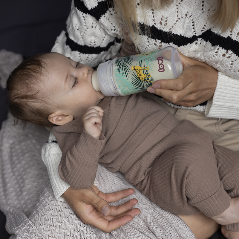 Детская бутылочка для кормления оснащена уникальной динамической соской из тонкого силикона, с жестким профилированным основанием и системой отвода воздуха Super Vent.