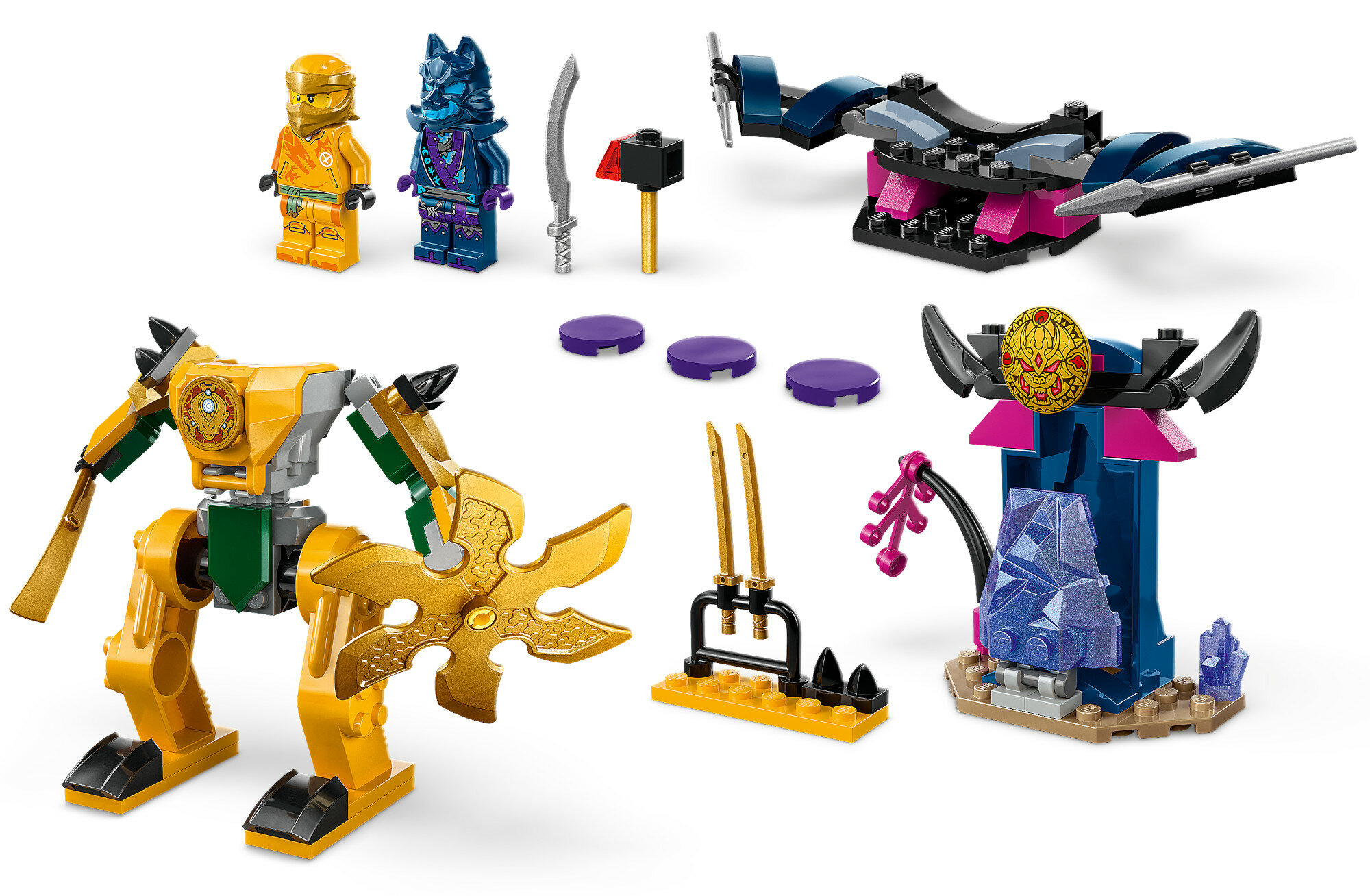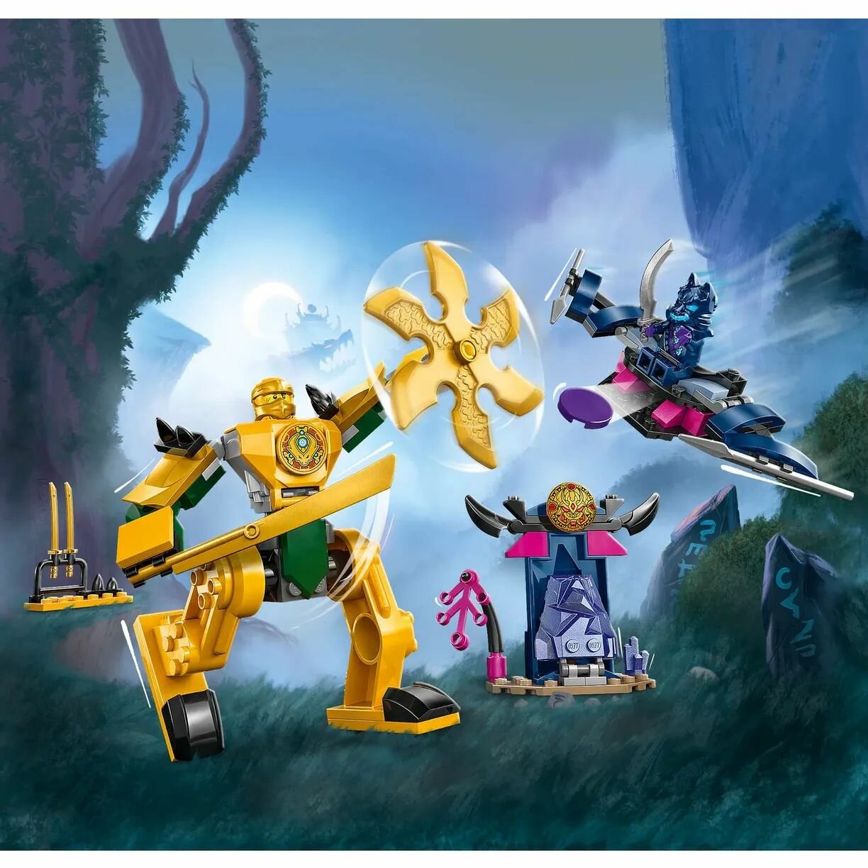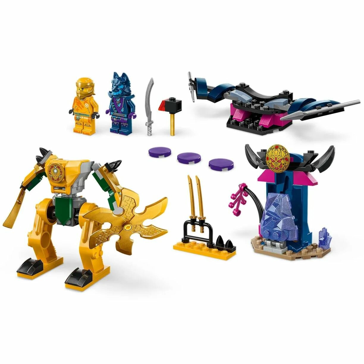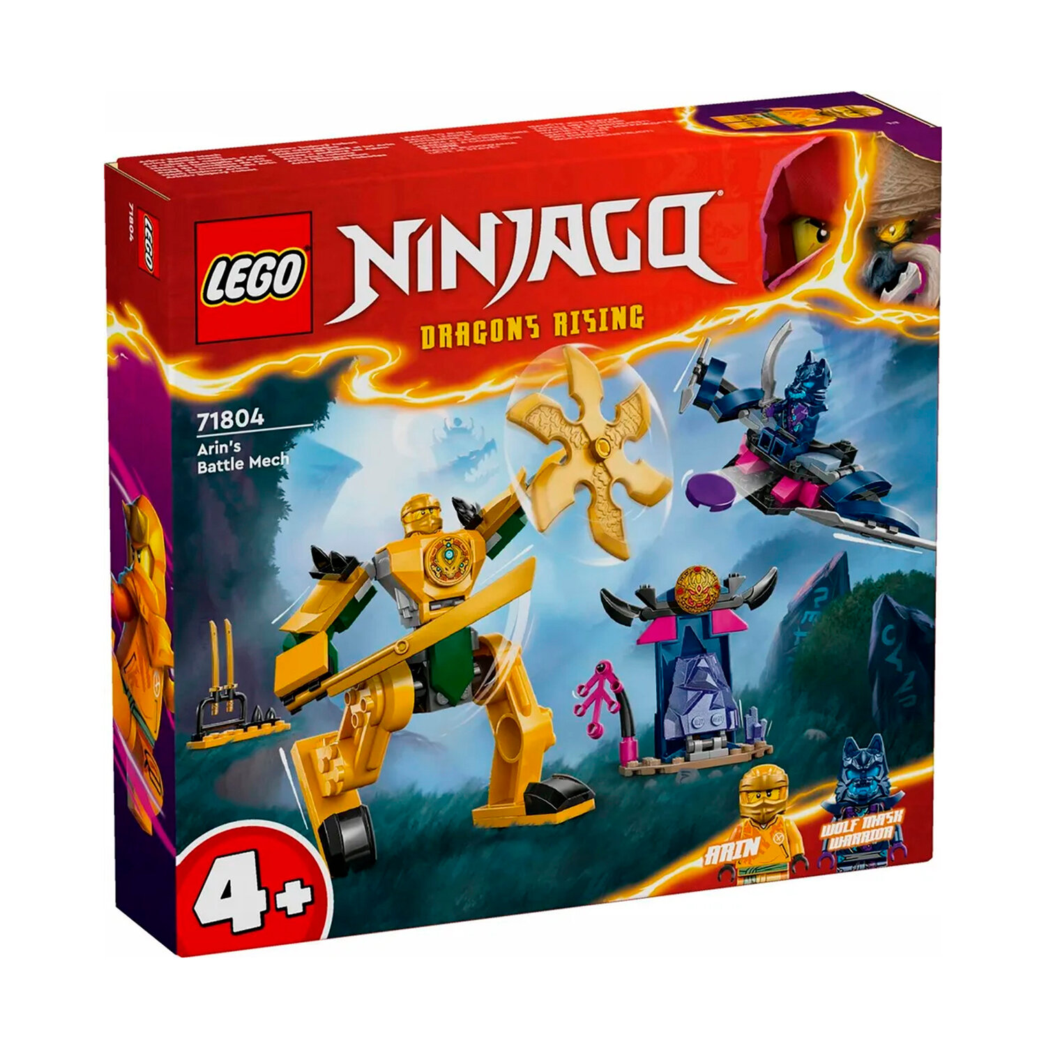 Игрушка-ниндзя Arin's Battle Mech позволяет детям в возрасте от 4 лет научиться конструировать, присоединяясь к попыткам героев-ниндзя спасти своих друзей-драконов. Эта игрушка для ролевых игр включает в себя впечатляющую фигурку меха, чтобы вдохновить детей на воссоздание захватывающих приключений из второго сезона телешоу Ninjago Dragons Rising. В этот набор LEGO входят 2 мини фигурки: Арин с аксессуаром в виде катаны и воин в волчьей маске с аксессуаром в виде меча. Арин помещается в складную фигурку меча, который владеет большим мечом и вращающимся лезвием, а воин в маске волка может летать на планере со складными крыльями, дисковой стрелялкой и двумя копьями. Также в наборе есть построенная из кирпичей кристальная пещера с волшебным молотом внутри и оружейная стойка с двумя золотыми мечами-катанами. Эта игрушка-ниндзя была разработана, чтобы доставить удовольствие детям в возрасте от 4 лет, которые открывают для себя радость строительства из кирпичиков LEGO. В комплект входит стартовый кирпичик: частично построенная основа, которая поможет детям быстро и уверенно строить.