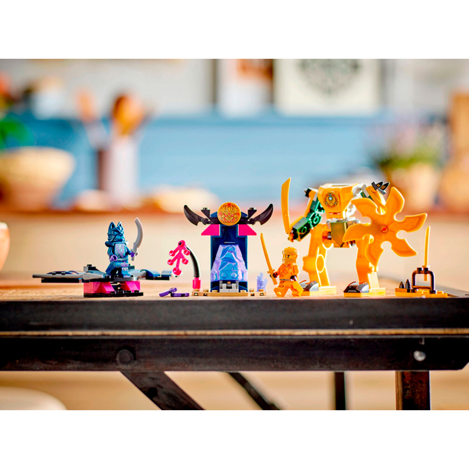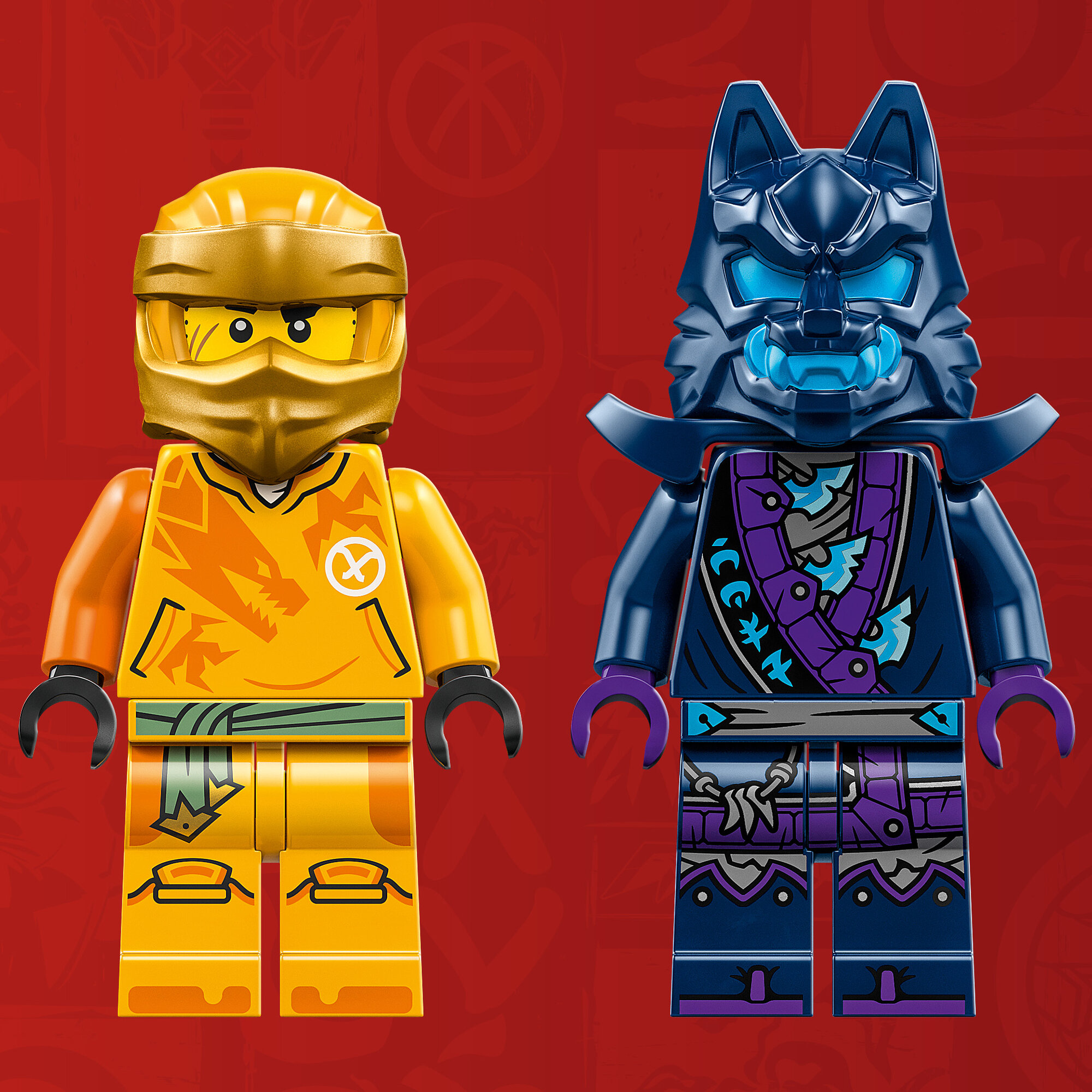 - 2 мини фигурки LEGO Ninjago - в игровой набор "Ниндзя" входит мини фигурка Арина, вооруженного катаной, чтобы дети могли разыграть действия против воина в волчьей маске с его мечом