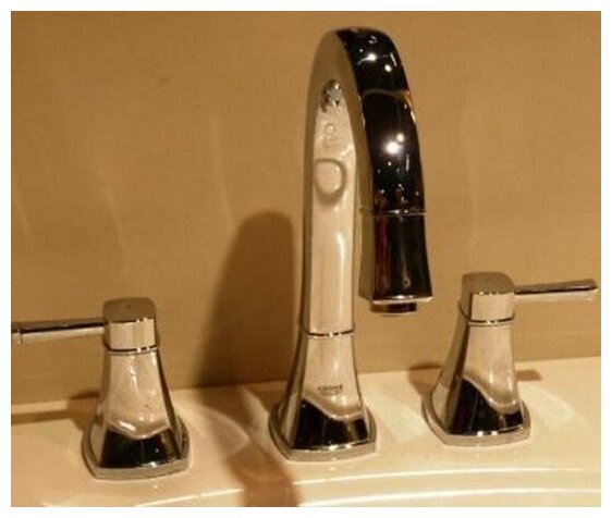 Смеситель для раковины с донным клапаном, монтаж на 3 отверстия, керамические вентили с углом поворота 90. Расход воды при давлении 3 бара приблизительно 5 л/мин, рекомендуемое рабочее давление 1 -5 бар. Хромированная поверхность GROHE StarLight .