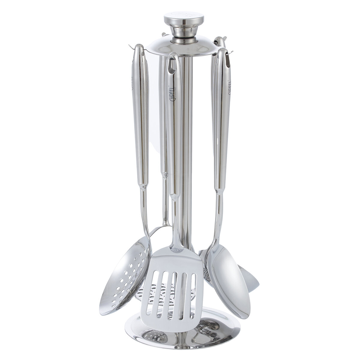 Набор кухонных аксессуаров Gipfel New Sharm 51903 5 предметов на подставке: половник 35 см, лопатка с прорезями 35 см, шумовка 35 см, ложка 35 см, толкушка 35 см.