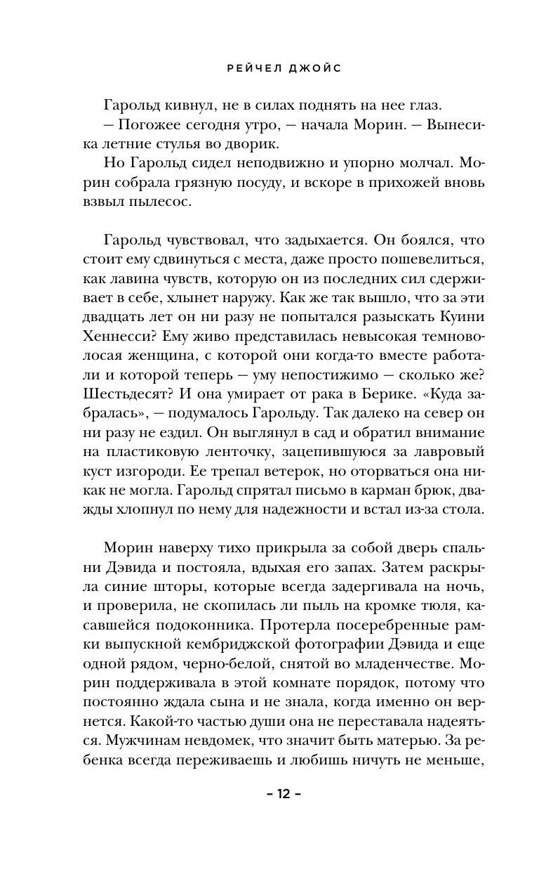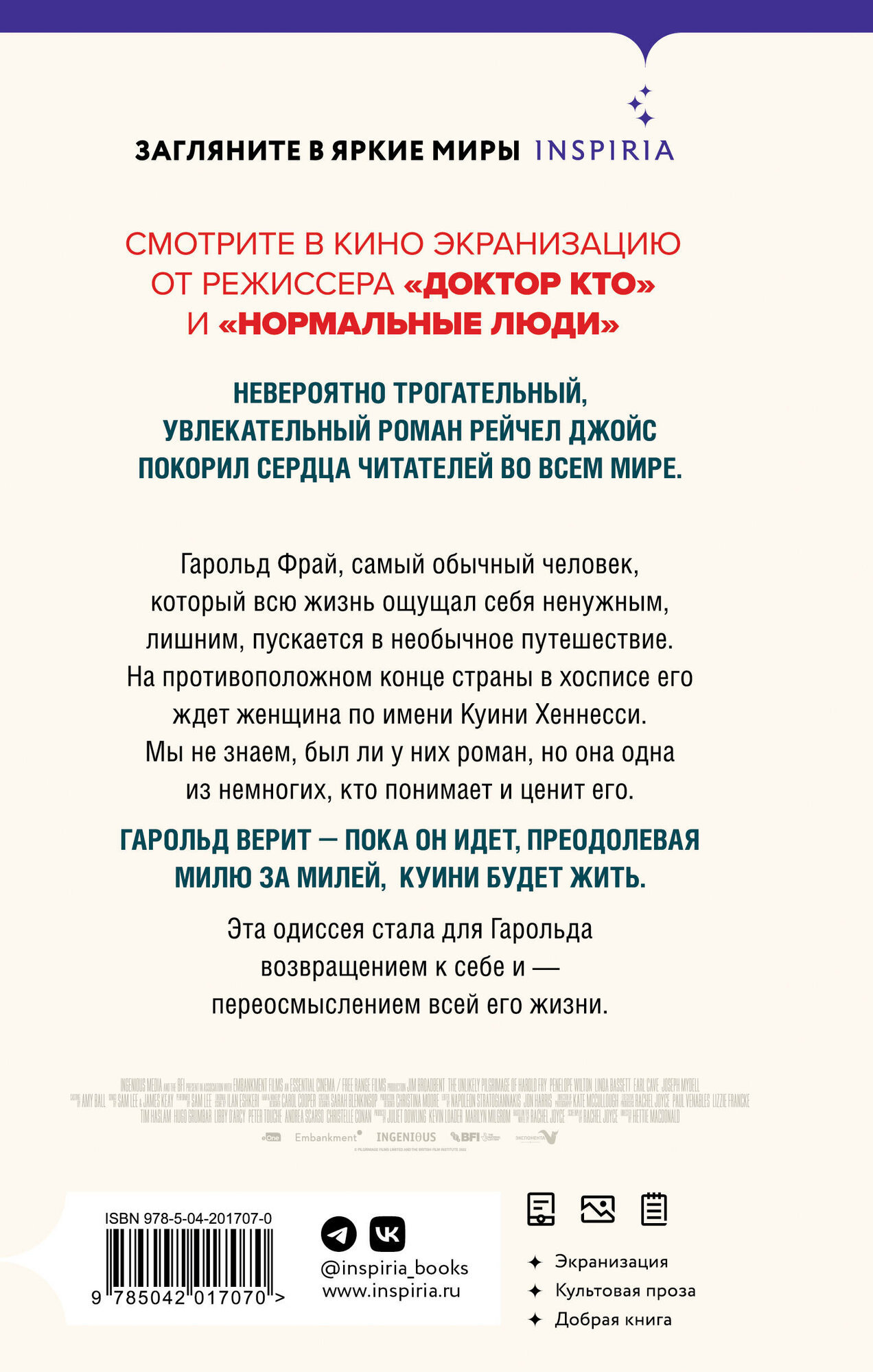 Невероятно трогательный, увлекательный роман Рейчел Джойс покорил сердца читателей во всем мире. Гарольд Фрай, самый обычный человек, который всю жизнь ощущал себя ненужным, лишним, пускается в необычное путешествие. На противоположном конце страны в хосписе его ждет женщина по имени Куини Хеннесси. Мы не знаем, был ли у них роман, но она, одна из немногих, понимала и ценила его. Гарольд верит — пока он идет, преодолевая милю за милей, Куини будет жить. Эта одиссея стала для Гарольда возвращением к себе и — переосмыслением всей его жизни.