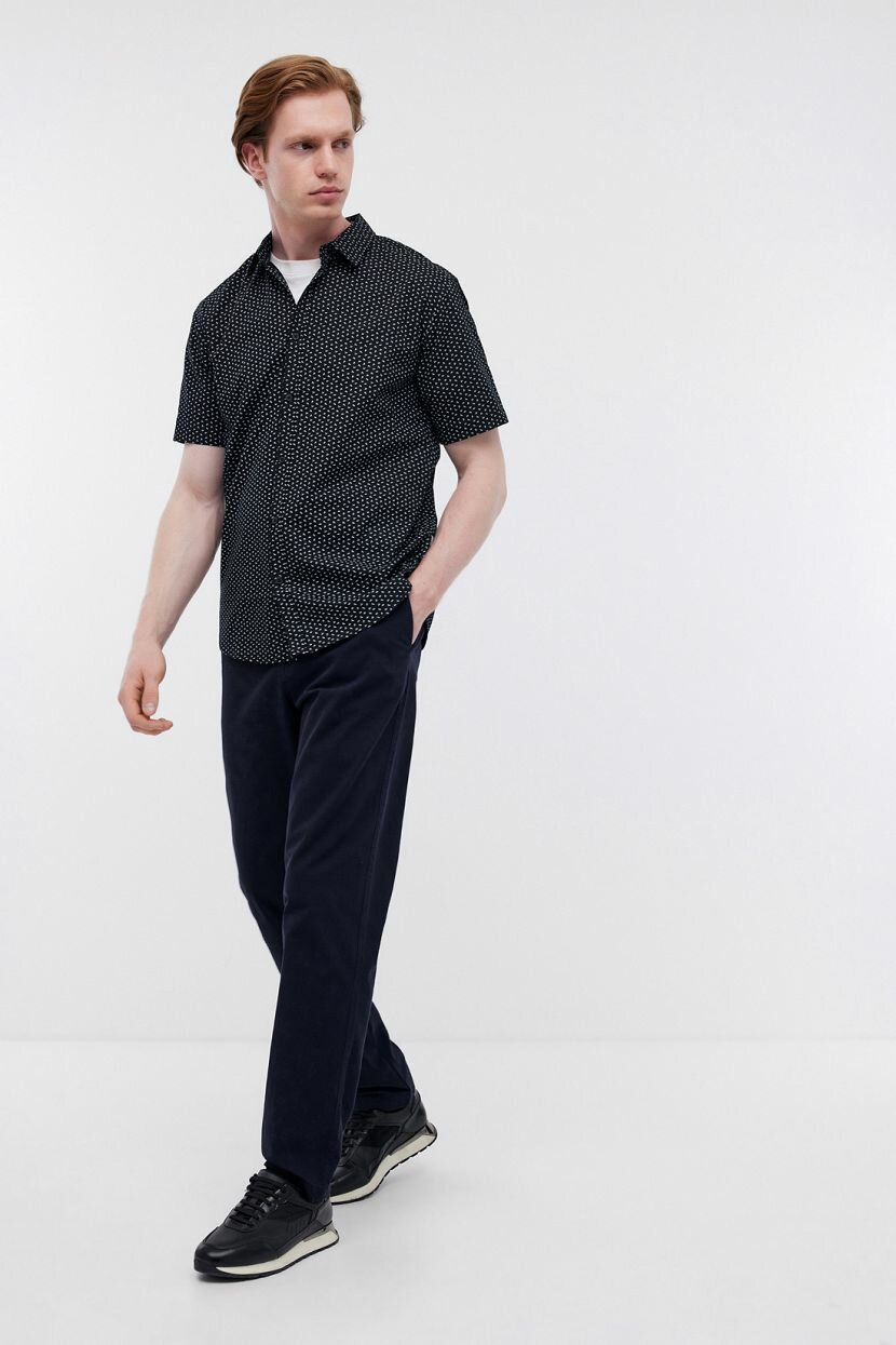 Мужская рубашка - универсальный предмет гардероба, который легко сочетается с повседневными и классическими вещами. Прямой силуэт позволяет скрыть недостатки и выигрышно подчеркнуть достоинства. Он делает фигуру визуально более рельефной. Можно носить навыпуск или заправлять благодаря фигурной линии низа. Оптимально надевать самостоятельно или интегрировать в кэжуал лук в качестве составляющей многослойного образа. Отложной воротник на стойке плавно переходит в планку на пуговицах в тон. Модель деловой одежды для офиса выполнена из качественного натурального хлопка. Хлопковый материал обладает дышащими свойствами и гигроскопичен за счет чего ношение в течение целого дня максимально комфортно.