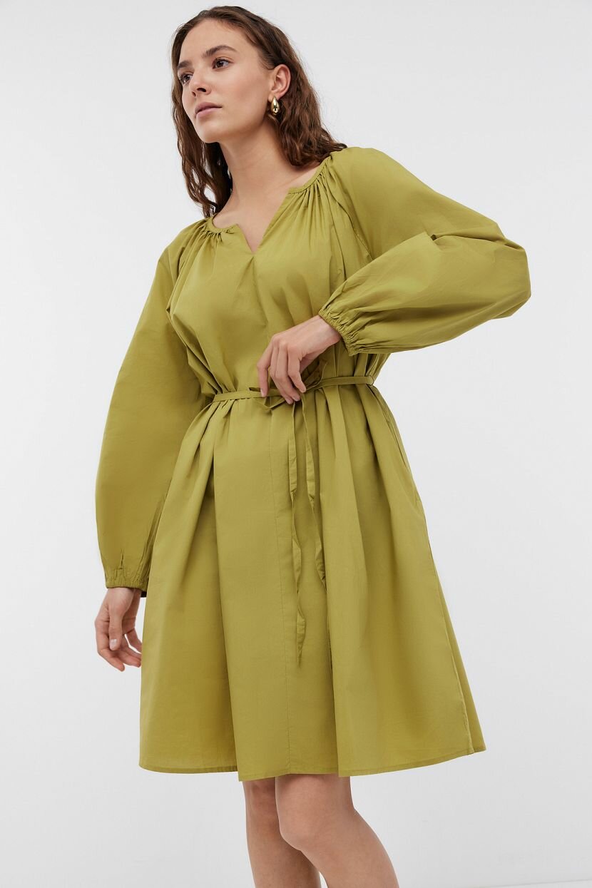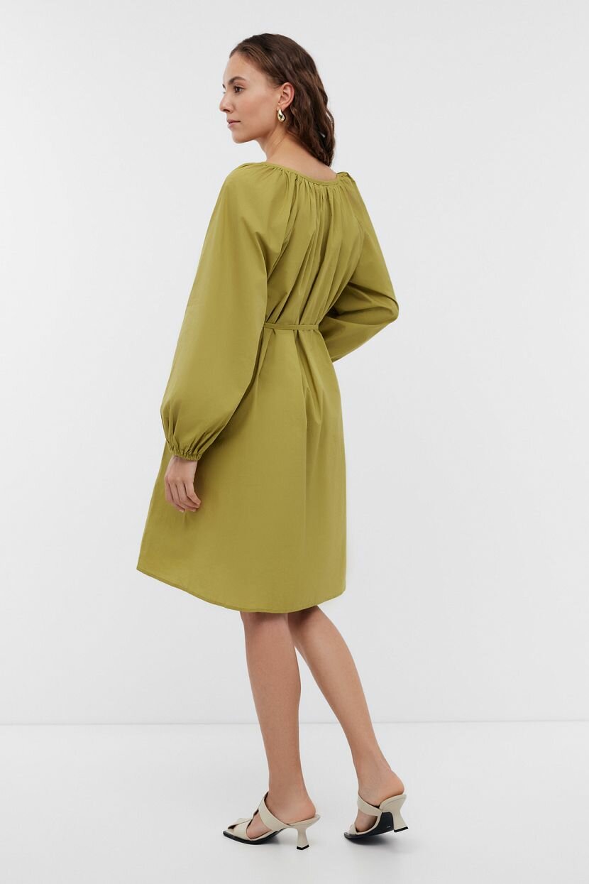 Платье миди - стильная и практичная вещь для женского гардероба на каждый день. Уместно для офиса и повседневного ношения. Оно дарит удобство и позволяет наслаждаться свободой движений. Модель средней длины с длинным рукавом декорирована сборками по горловине. Красивая драпировка служит оригинальным украшением. Обладает свободным воздушным силуэтом, который подчеркивает достоинства. Узкий пояс из основного полотна ставит акцент на талии и утонченности пропорций. Предусмотрены вместительные боковые карманы. Изделие выполнено из хлопкового поплина. Натуральный однотонный материал пропускает воздух и гигроскопичен. Хлопок устойчив к деформации и не требует специального ухода. Ткань мягкая и приятная к телу.