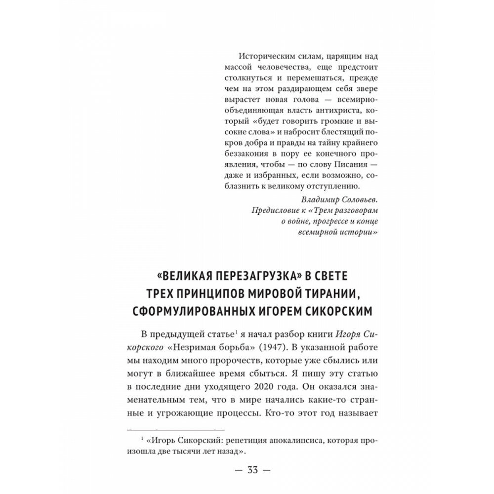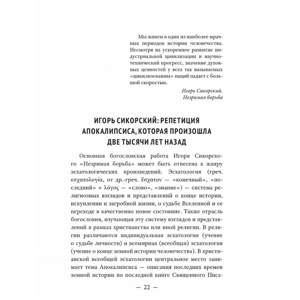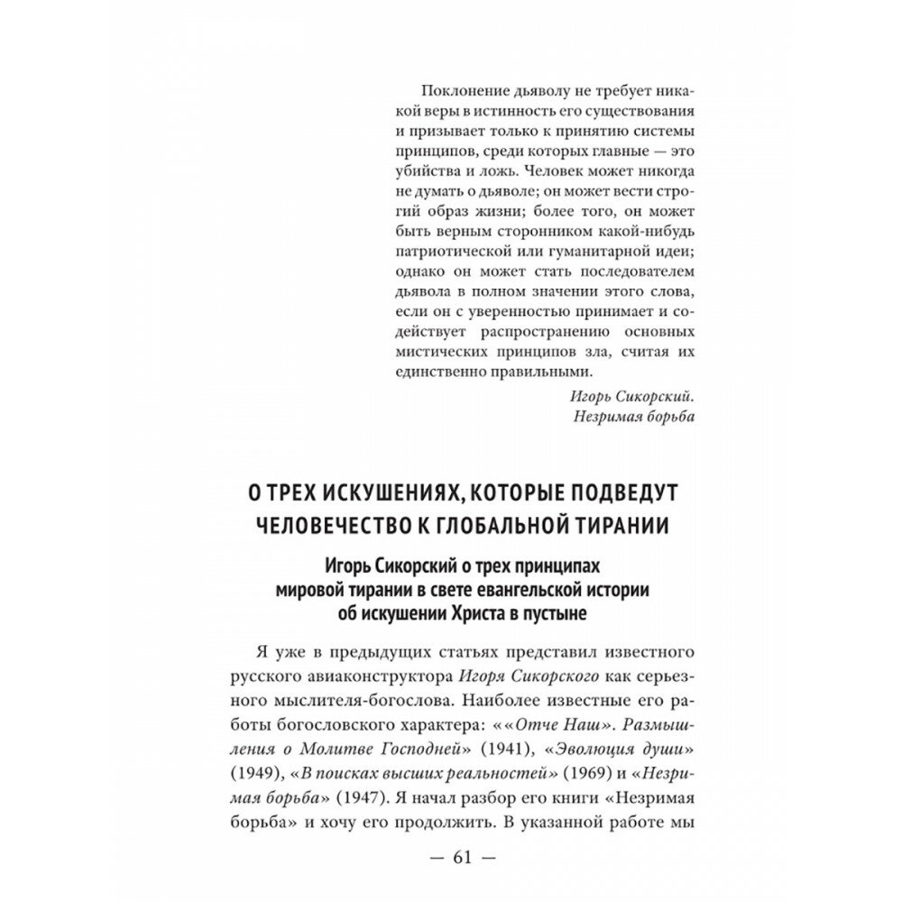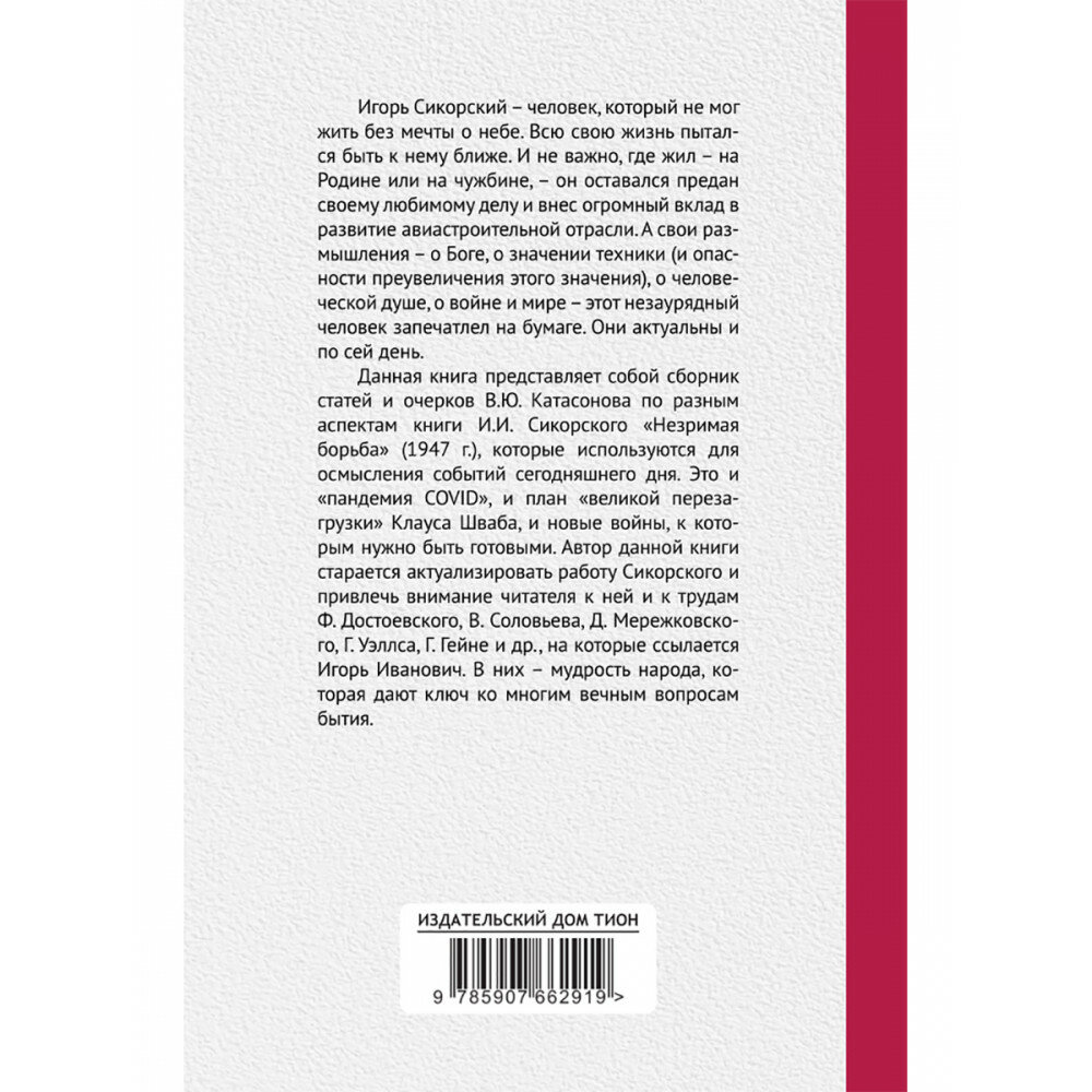 Данная книга представляет собой сборник статей и очерков В. Ю. Катасонова по разным аспектам книги И. И. Сикорского "Незримая борьба" (1947 г.), которые используются для осмысления событий сегодняшнего дня. Это и "пандемия COVID", и план "великой перезагрузки" Клауса Шваба, и новые войны, к которым нужно быть готовыми. Автор данной книги старается актуализировать работу Сикорского и привлечь внимание читателя к ней и к трудам Ф. Достоевского, В. Соловьева, Д. Мережковского, Г. Уэллса, Г. Гейне и др., на которые ссылается Игорь Иванович. В них — мудрость народа, которая дают ключ ко многим вечным вопросам бытия.