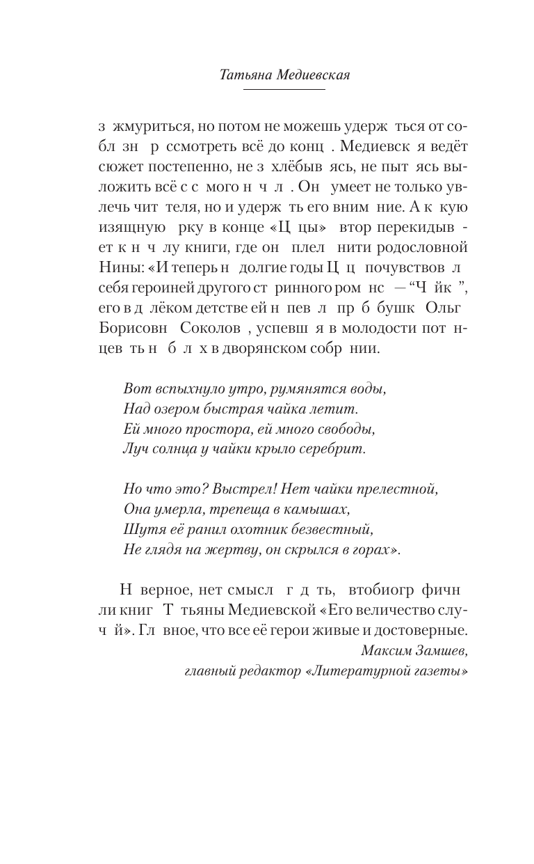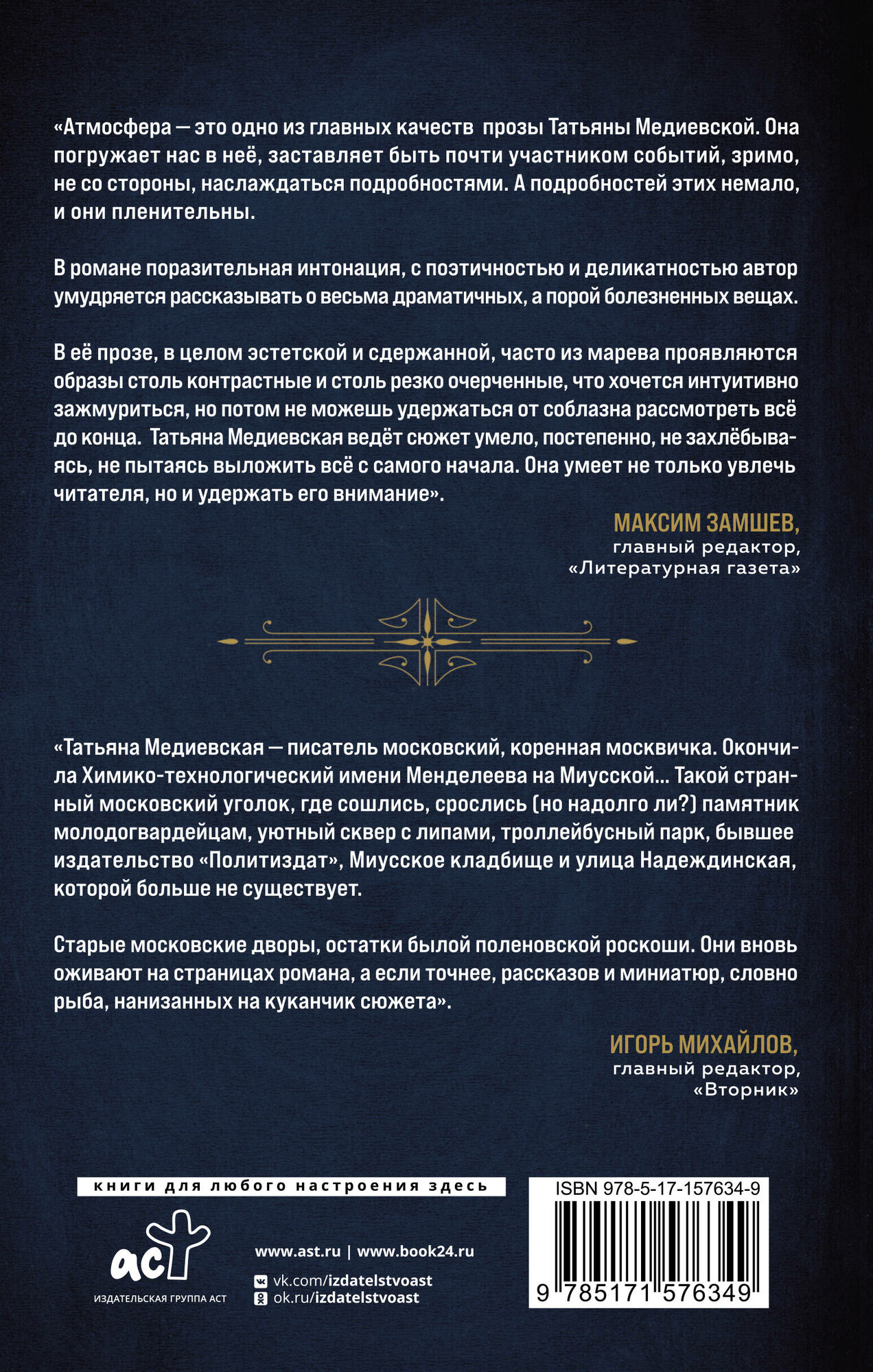 Проза Татьяны Медиевской не претендует на детальное исследование человеческих страстей и поступков. Но в мимолётных мгновениях вчерашних дней, которые она передаёт, с необыкновенным очарованием и непринуждённостью проступает история рода коренной москвички, быт и события двух прошедших веков… В судьбах героинь Медиевской царит Его величество случай. Кажется, что здесь даже незначительная малость может разрушить жизни, если только люди не успеют осмыслить происшедшее, не окажутся способны противостоять накату неприятностей, не обретут — через метания и муки — мудрость и мужество. Татьяна Медиевская — прозаик, поэт, драматург. Автор сборников прозы «В поисках Цацы» и «Всё сбудется»; поэтических книг «Надежда» и «В поисках смыслов»; сборника пьес «Взрослые ответы на детские вопросы». Рассказы и стихи писательницы публиковались в журналах «Юность», «Русский пионер», «Лиterraтура», «Вторник». «В прозе Медиевской много волшебства. Часто нечто оказывается не тем, чем его считали». Максим ЗАМШЕВ, главный редактор «Литературной газеты»