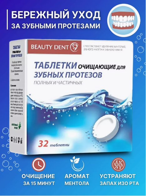 Очищающие таблетки для зубных протезов Beauty Dent помогают удалить бактерии, зубной налет и зубной камень даже в труднодоступных местах. Таблетки быстро растворяются в воде и бережно ухаживают за протезами, не повреждая их. • Очищение за 15-30 минут. • Аромат ментола надолго сохраняет ощущение свежести. Таблетки Beauty Dent обладают бактерицидным действием, способствуют уменьшению количества бактерий и нейтрализации неприятного запаха изо рта.
