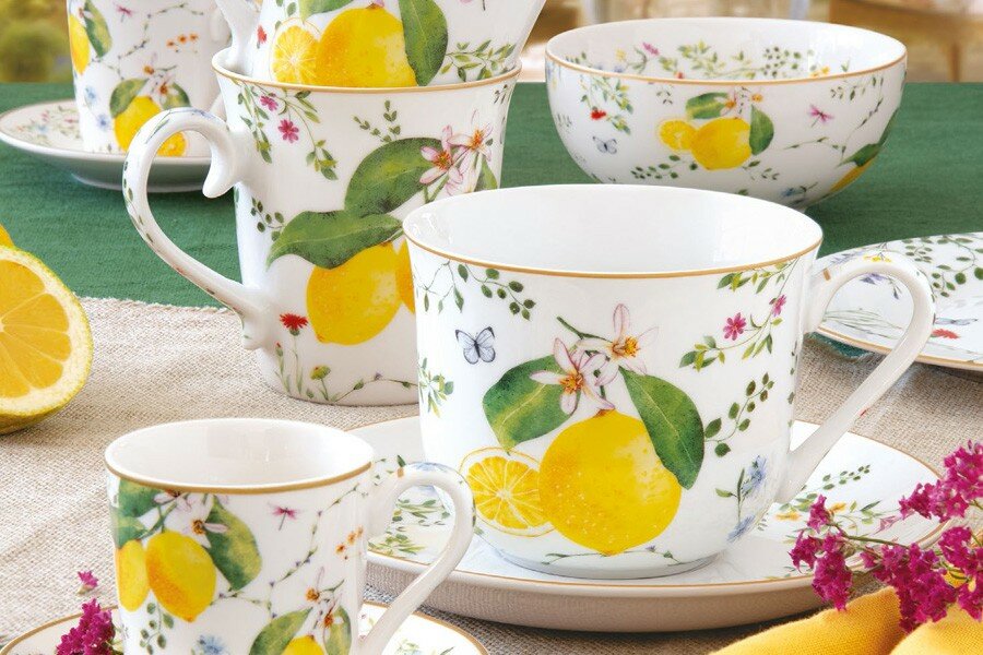 Декоры с лимонами очень популярны в оформлении столовой посуды.Нежный цветочный декор перемежается сочными изображениями лимонов на чистом белом фоне. Контрастные жёлтые блюда и салатники добавят живости и солнечности оформлению стола, а также могут использоваться отдельно. Идеальная коллекция в преддверии тёплых летних дней.Изделия можно мыть в посудомоечной машине и использовать в микроволновой печи