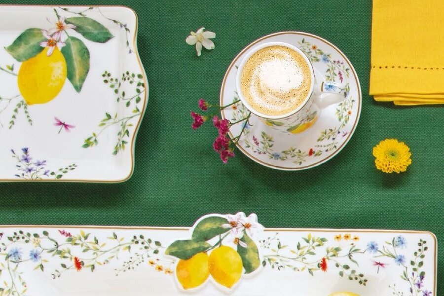 Декоры с лимонами очень популярны в оформлении столовой посуды.Нежный цветочный декор перемежается сочными изображениями лимонов на чистом белом фоне. Контрастные жёлтые блюда и салатники добавят живости и солнечности оформлению стола, а также могут использоваться отдельно. Идеальная коллекция в преддверии тёплых летних дней.Изделия можно мыть в посудомоечной машине и использовать в микроволновой печи