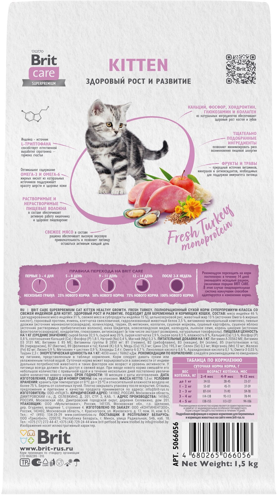 Корм сухой для котят Brit Care Cat Kitten Healthy Growth индейка 15 кг