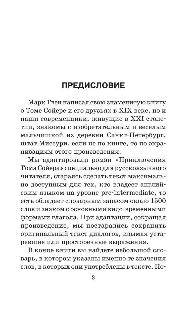 В книгу вошел адаптированный и сокращенный текст романа Марка Твена "Приключения Тома Сойера". Предназначается для продолжающих изучать английский язык (уровень владения языком - Pre-Intermediate). Книга также содержит комментарии, словарь и упражнения.