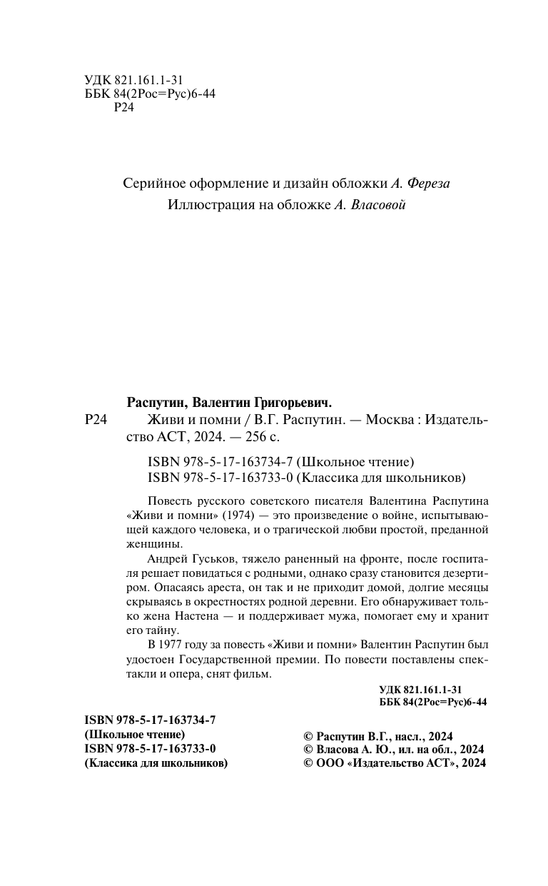 Книга: Живи и помни (Валентин Григорьевич Распутин); АСТ, 2024