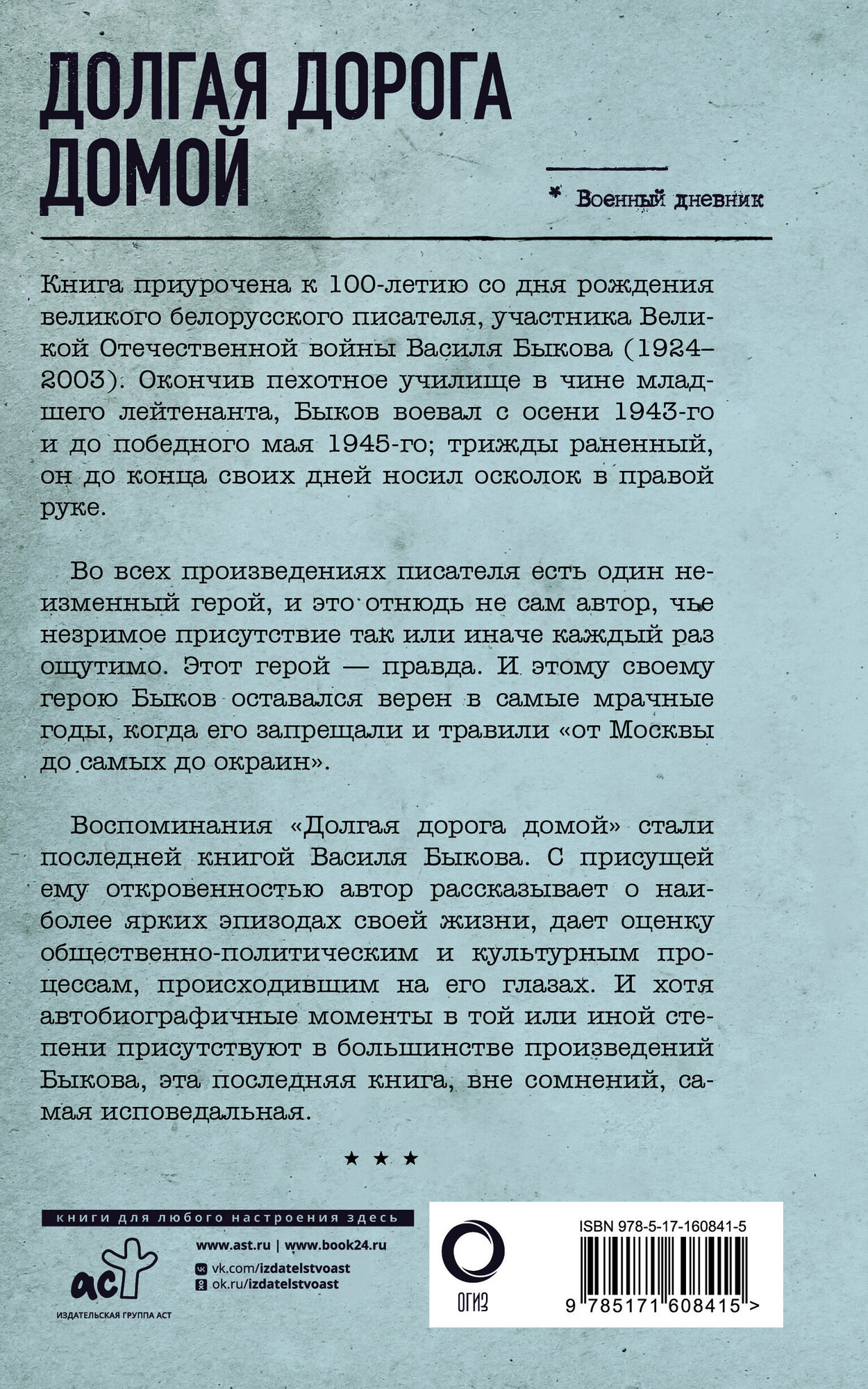 Книга приурочена к 100-летию со дня рождения великого белорусского писателя, участника Великой Отечественной войны Василя Быкова (1924–2003). Окончив пехотное училище в чине младшего лейтенанта, Быков воевал с осени 1943-го и до победного мая 1945-го; трижды раненный, он до конца своих дней носил осколок в правой руке. Во всех произведениях писателя есть один неизменный герой, и это отнюдь не сам автор, чье незримое присутствие так или иначе каждый раз ощутимо. Этот герой — правда. И этому своему герою Быков оставался верен в самые мрачные годы, когда его запрещали и травили «от Москвы до самых до окраин». Воспоминания «Долгая дорога домой» стали последней книгой Василя Быкова. С присущей ему откровенностью автор рассказывает о наиболее ярких эпизодах своей жизни, дает оценку общественно-политическим и культурным процессам, происходившим на его глазах. И хотя автобиографичные моменты в той или иной степени присутствуют в большинстве произведений Быкова, эта последняя книга, вне сомнений, самая исповедальная.