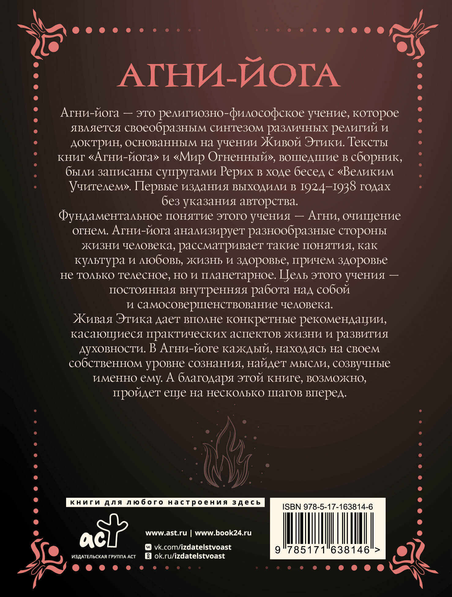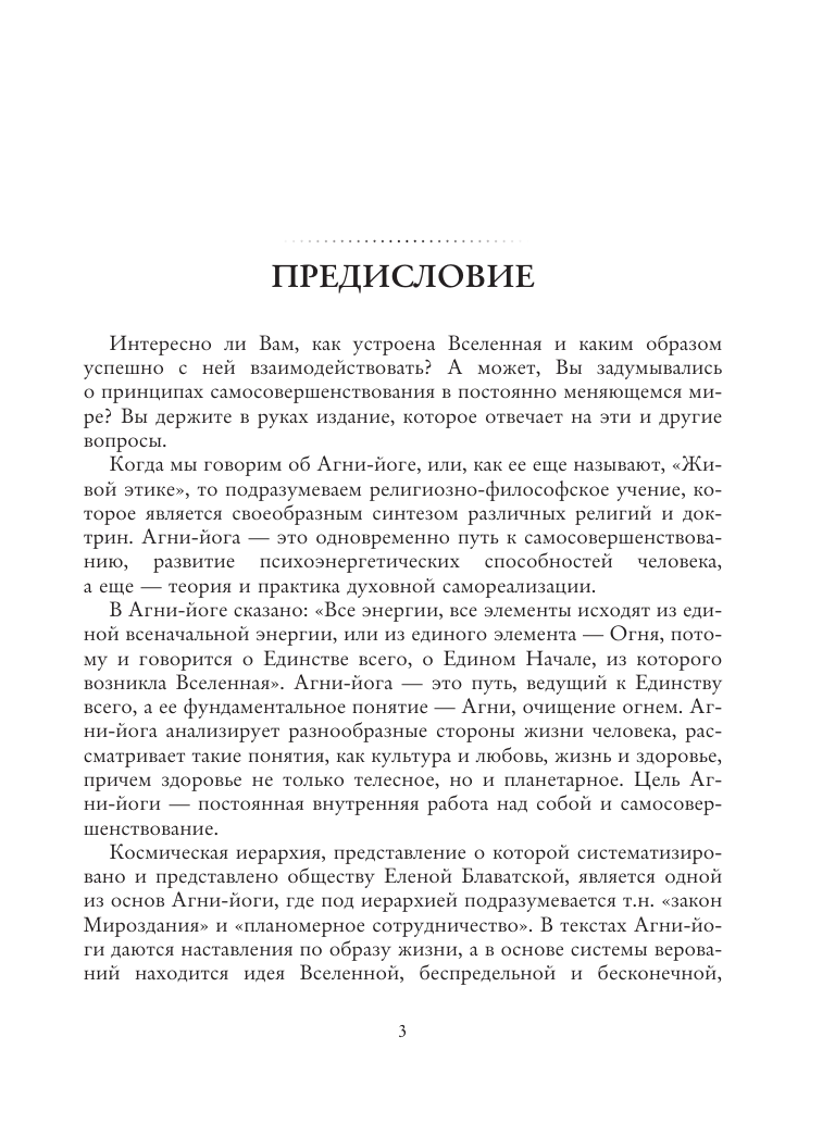Агни-йога — это религиозно-философское учение, которое является своеобразным синтезом различных религий и доктрин, основанным на учении Живой Этики. Тексты книг «Агни-йога» и «Мир Огненный», вошедшие в сборник, были записаны супругами Рерих в ходе бесед с «Великим Учителем». Первые издания выходили в 1924–1938 годах без указания авторства. Фундаментальное понятие этого учения — Агни, очищение огнем. Агни-йога анализирует разнообразные стороны жизни человека, рассматривает такие понятия, как культура и любовь, жизнь и здоровье, причем здоровье не только телесное, но и планетарное. Цель этого учения — постоянная внутренняя работа над собой и самосовершенствование человека. Живая Этика дает вполне конкретные рекомендации, касающиеся практических аспектов жизни и развития духовности. В Агни-йоге каждый, находясь на своем собственном уровне сознания, найдет мысли, созвучные именно ему. А благодаря этой книге, возможно, пройдет еще на несколько шагов вперед.